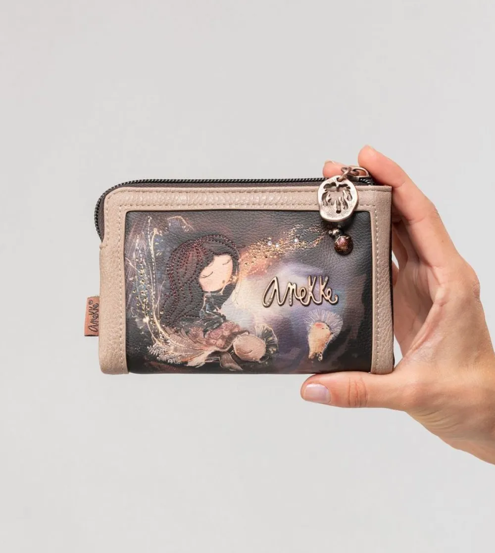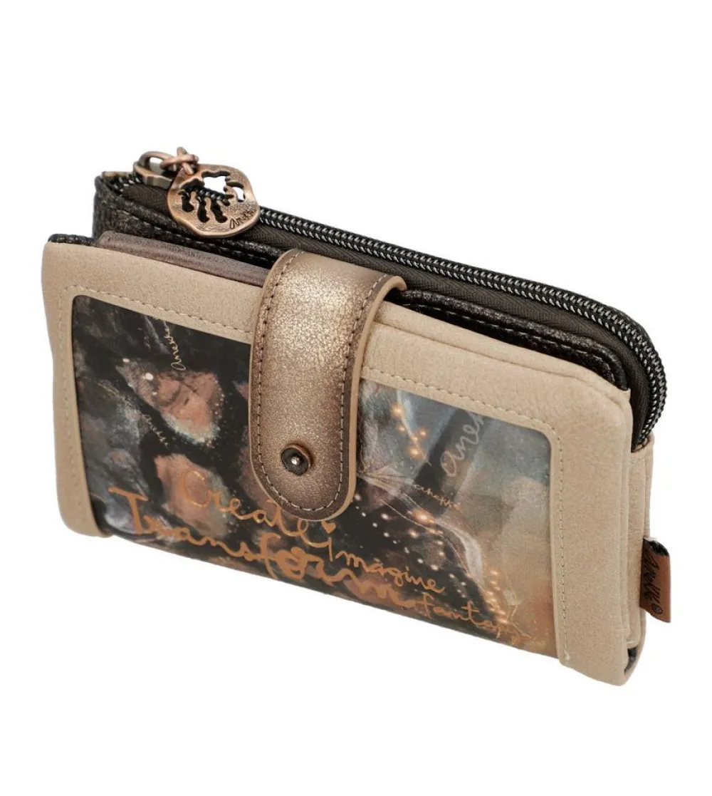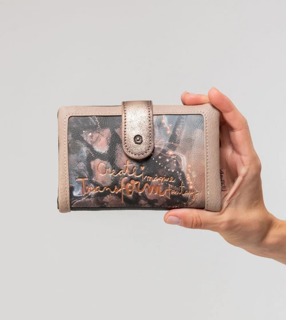 Portafoglio donna Anekke Dreamverse 39709-912. Realizzato in robusto PVC, tasca principale chiusa da bottone, con soffietti per banconote e doppio vano portadocumenti. Tasca portamonete posteriore chiusa da zip.