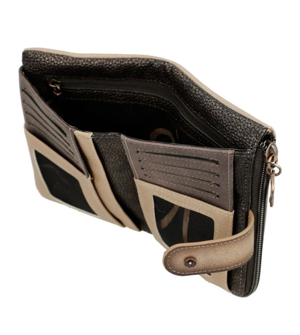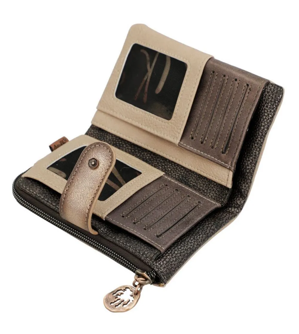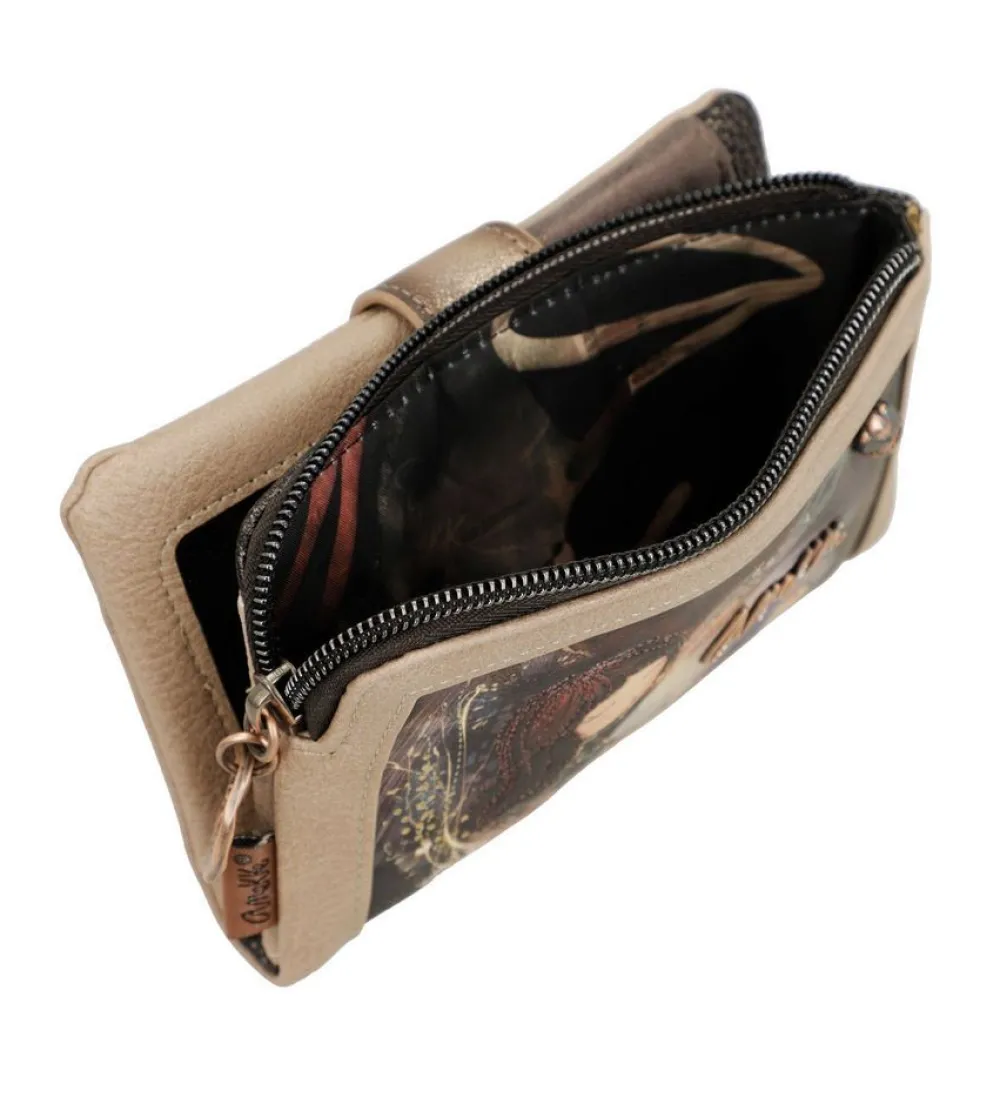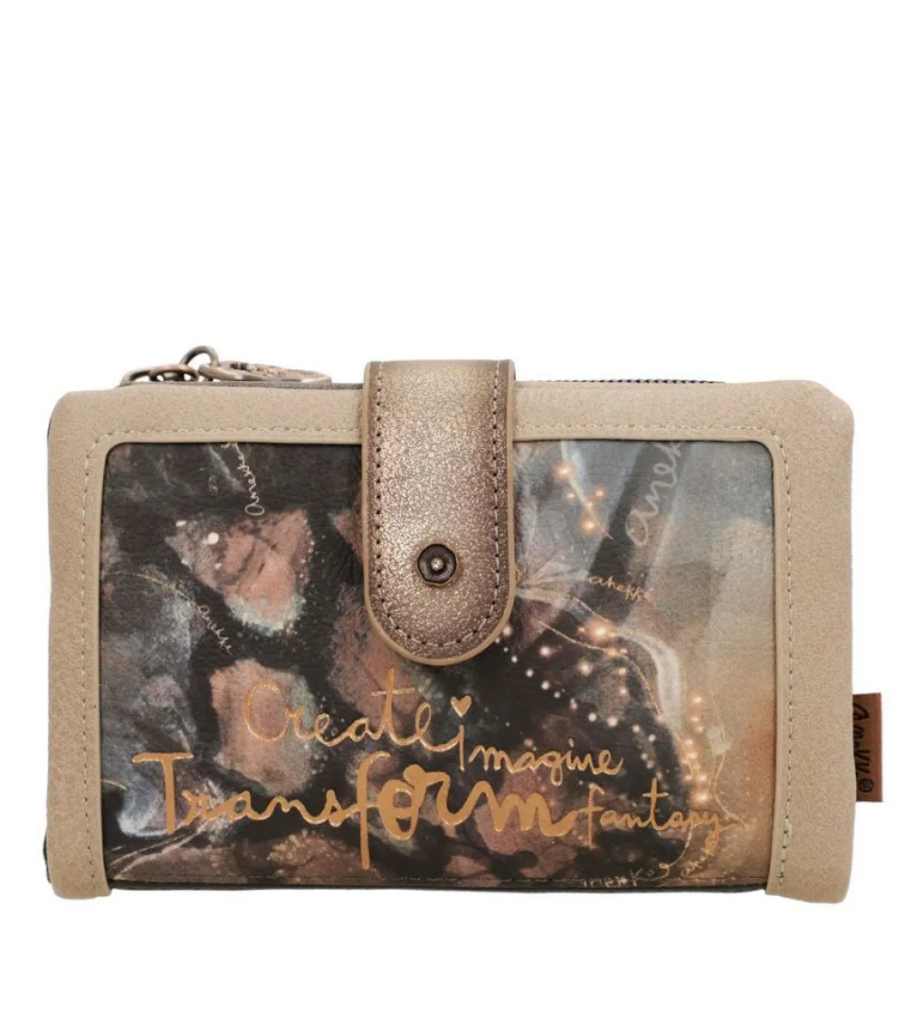 Portafoglio donna Anekke Dreamverse 39709-912. Realizzato in robusto PVC, tasca principale chiusa da bottone, con soffietti per banconote e doppio vano portadocumenti. Tasca portamonete posteriore chiusa da zip.