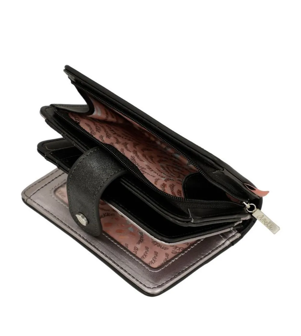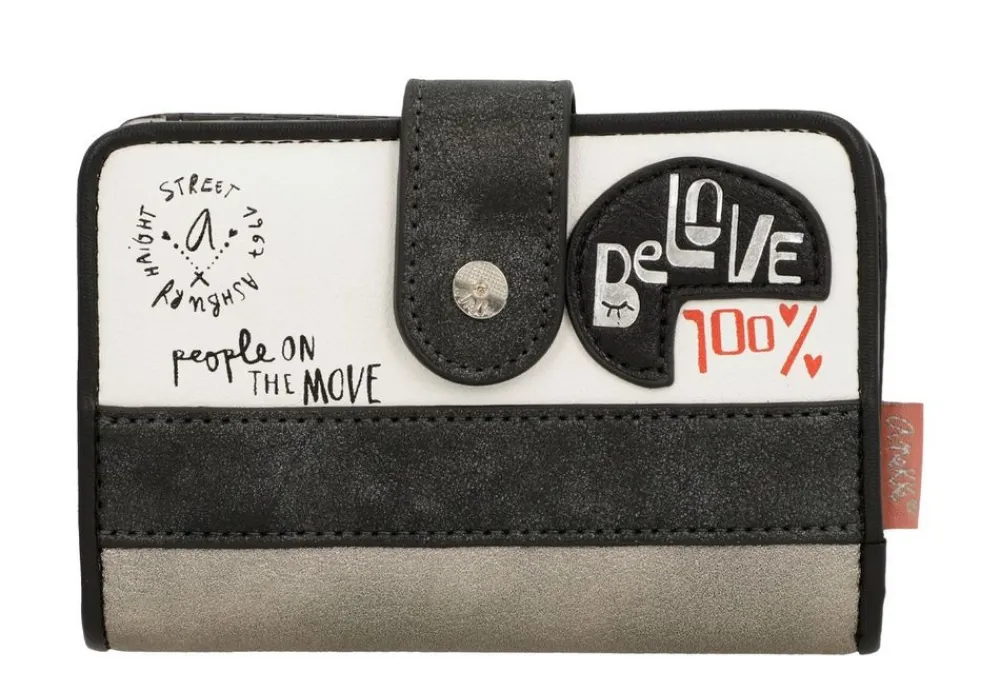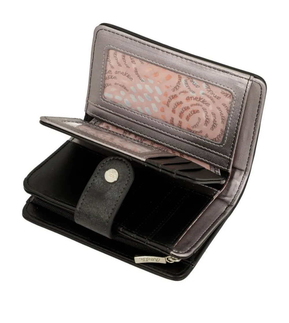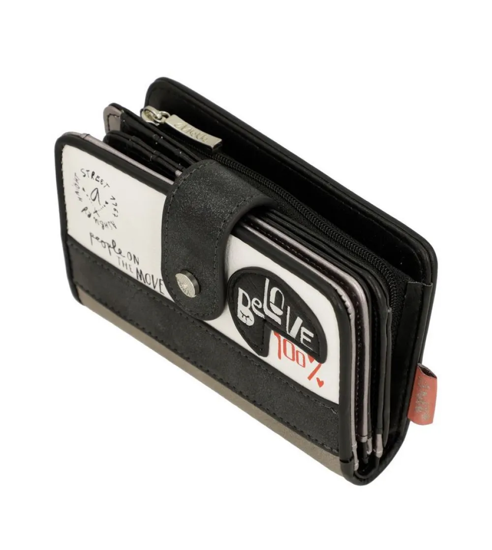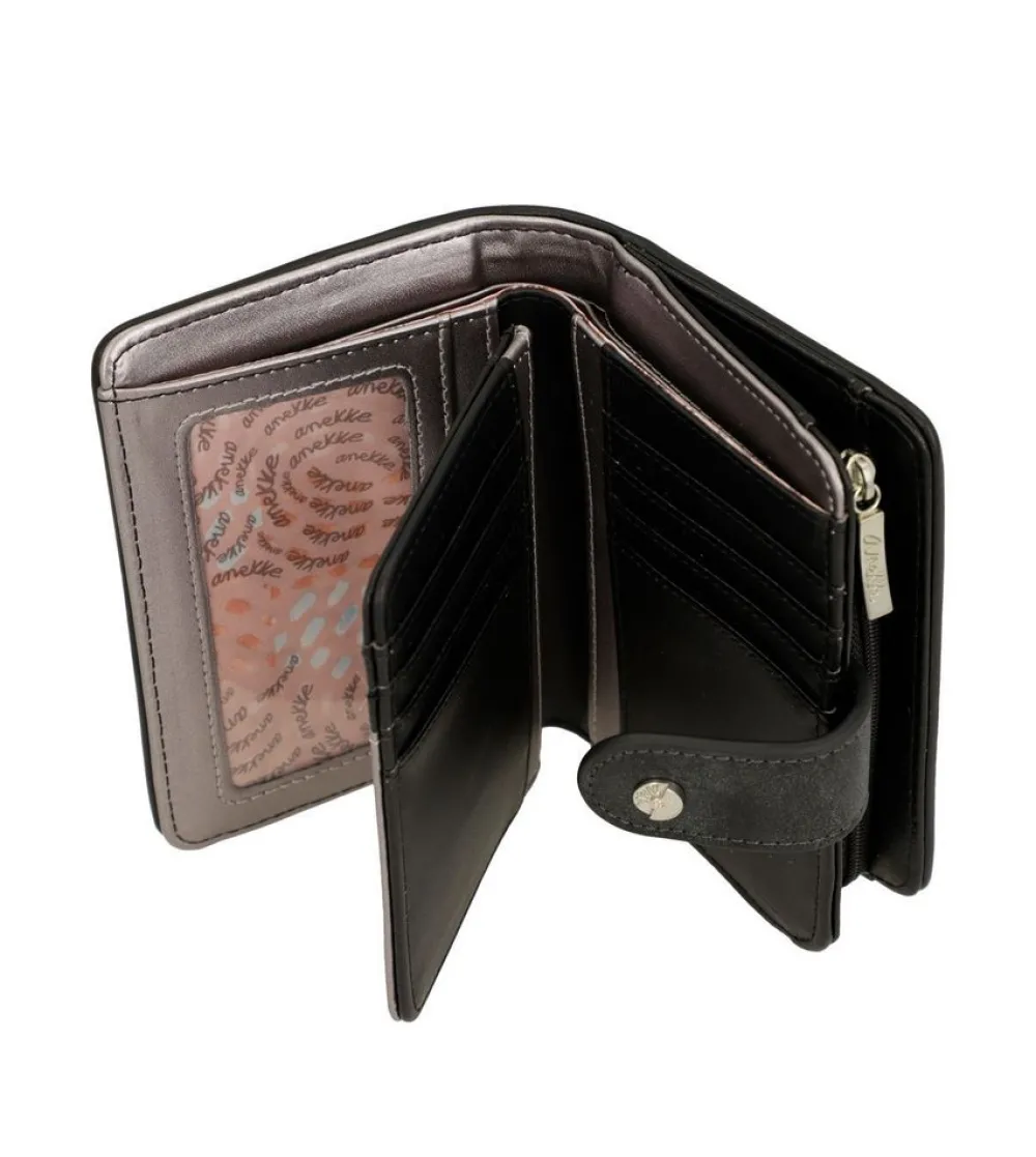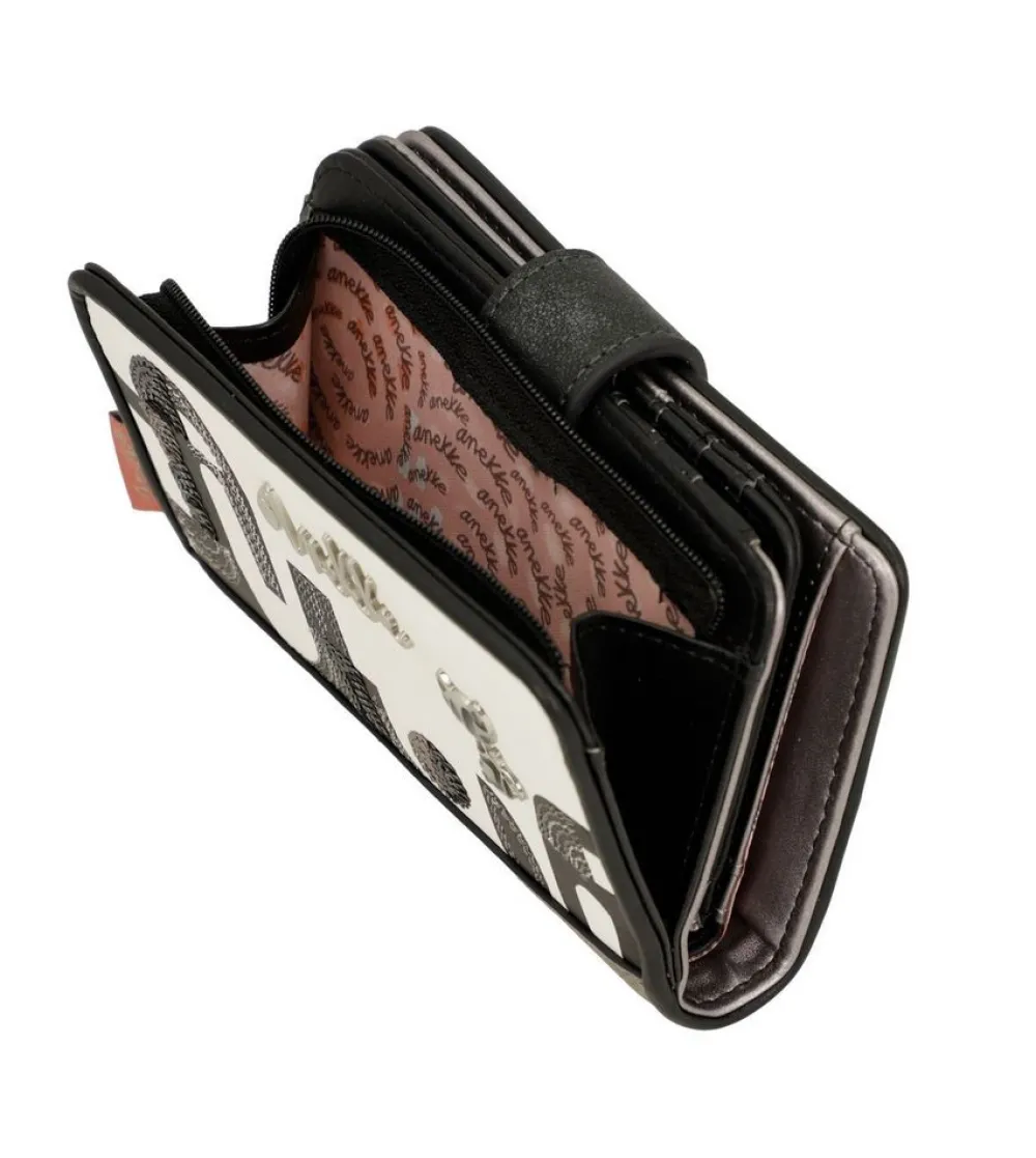 Portafoglio donna Anekke Sixties 38869-902 Black & White. Realizzato in robusto PVC, tasca principale chiusa da bottone, con soffietti per banconote e vano portadocumenti. Tasca portamonete posteriore chiusa da zip.