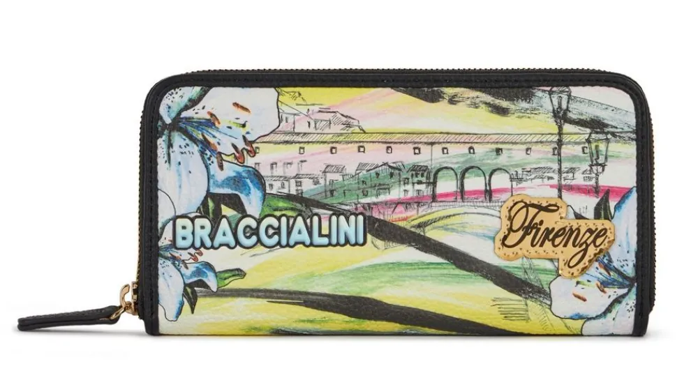 Portafoglio donna Braccialini Cartoline. Realizzato in pelle sintetica di alta qualità , tasca principale chiusa da zip con soffietti per banconote e tasca chiusa da zip per monete.