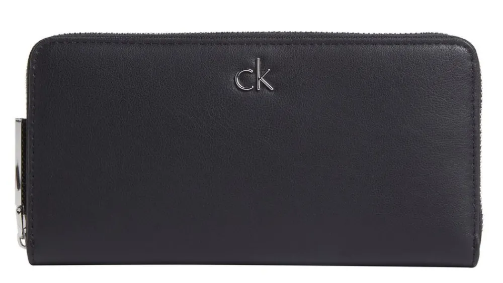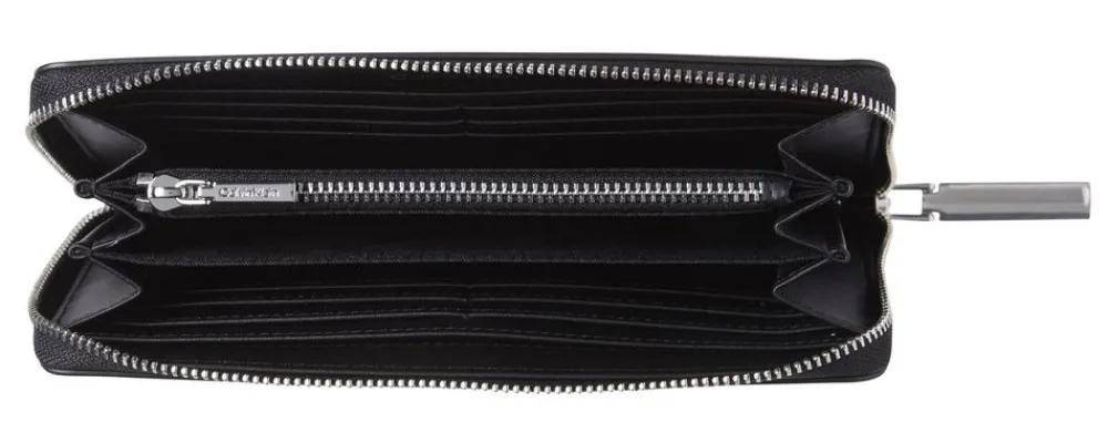Portafoglio donna con zip Calvin Klein. Realizzato in materiale sintetico, tasca principale chiusa da zip con soffietti per banconote e tasca chiusa da zip per monete. Tecnologia con blocco RFID. Logo frontale.