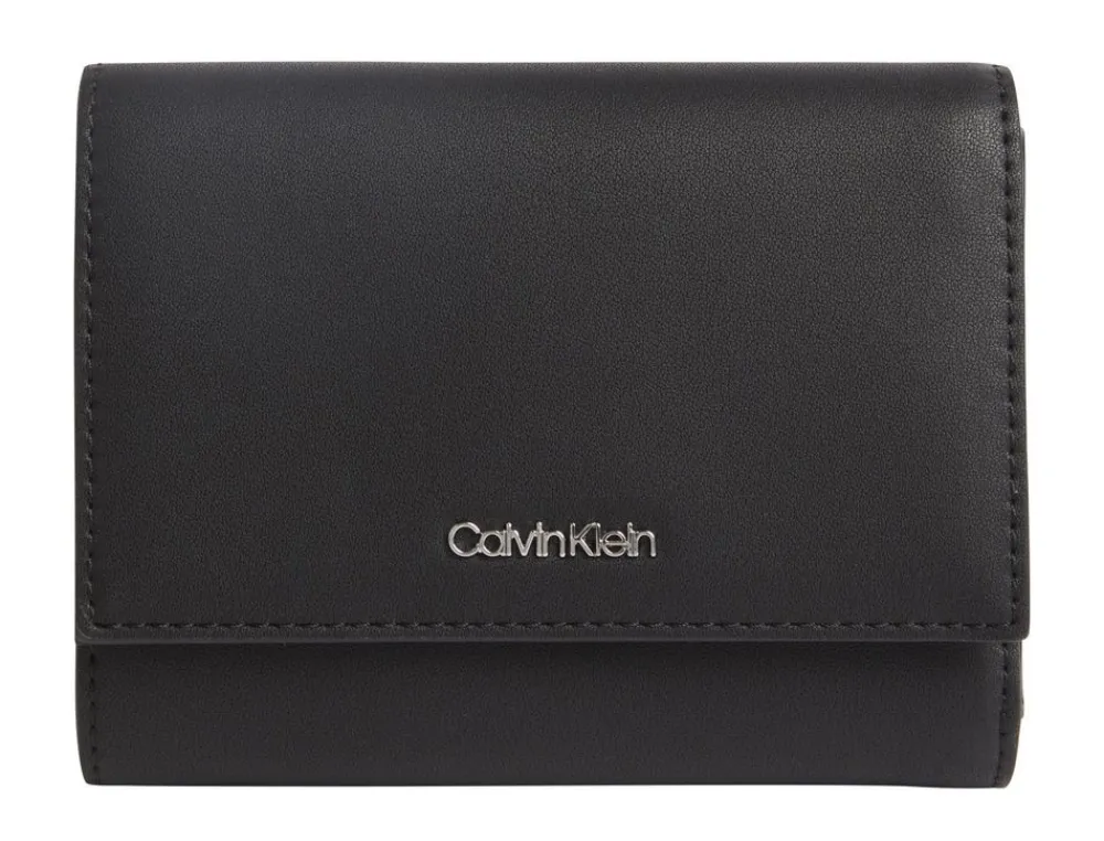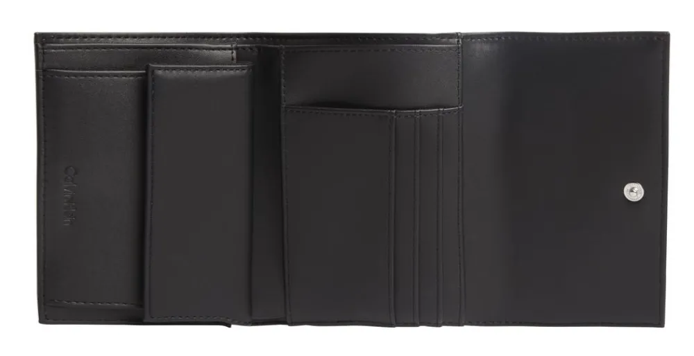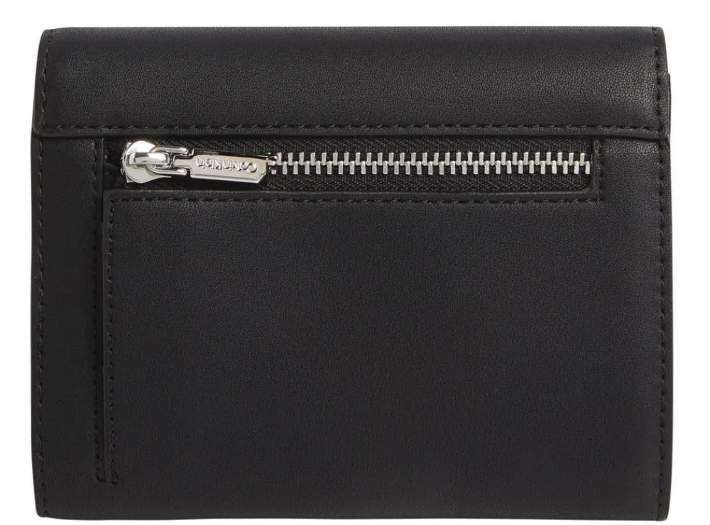 Portafoglio donna Calvin Klein. Tasca principale con vano portadocumenti, tasca portamonete chiuse da zip, vano banconote. Tecnologia con blocco RFID. Logo frontale.