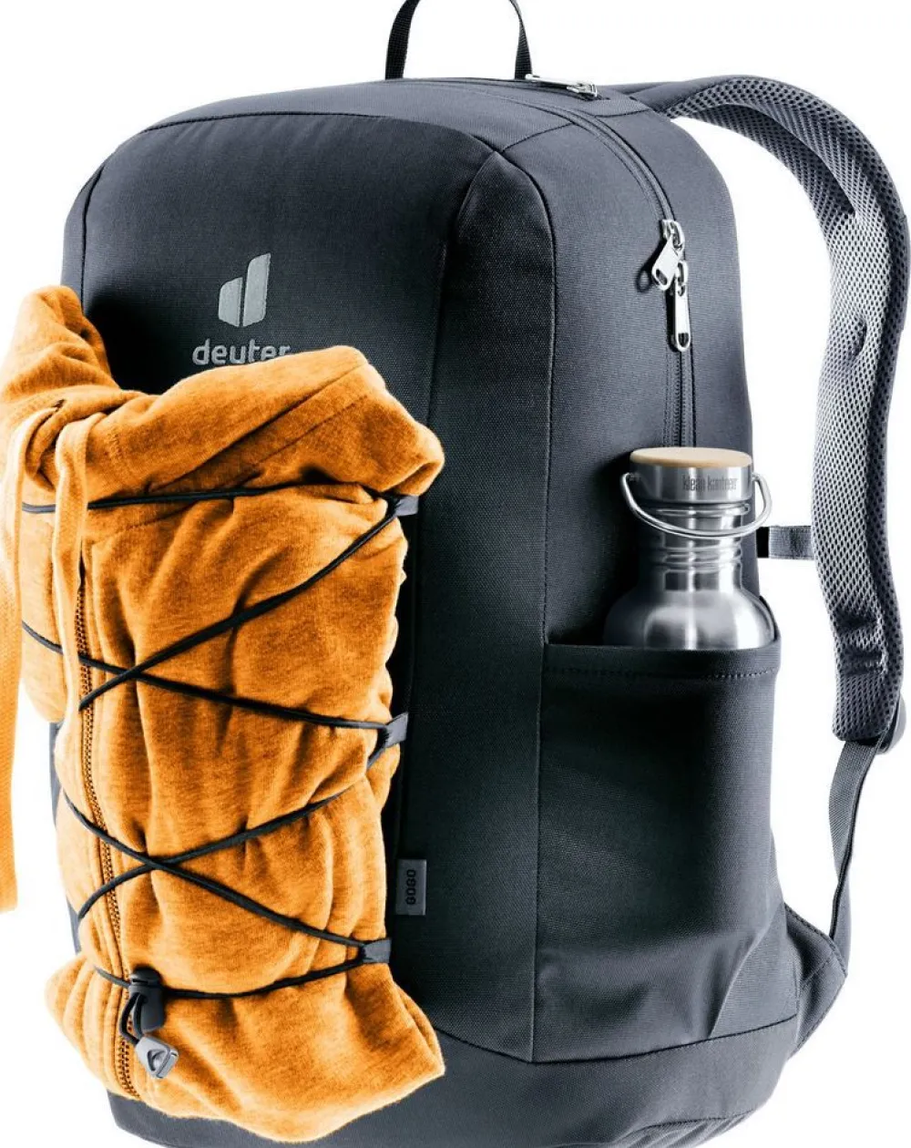 Zaino Deuter Gogo. Zaino realizzato in robusto poliestere, ampia tasca principale chiusa da zip, schienale imbottito e traspirante Deuter Airstripes, spallacci gommati e sagomati. Ampia tasca frontale e tasche laterali, per bottiglia e ombrello.