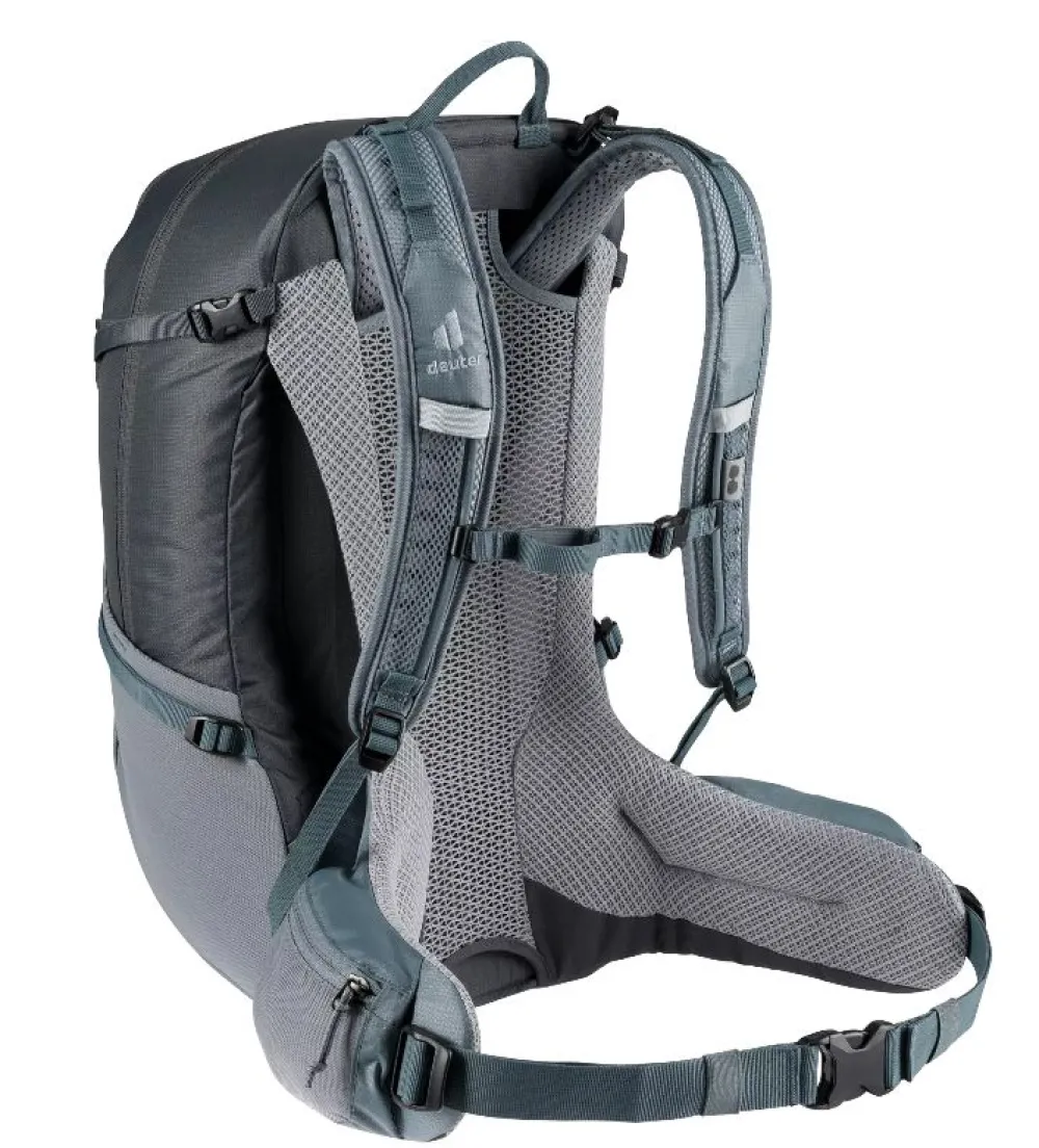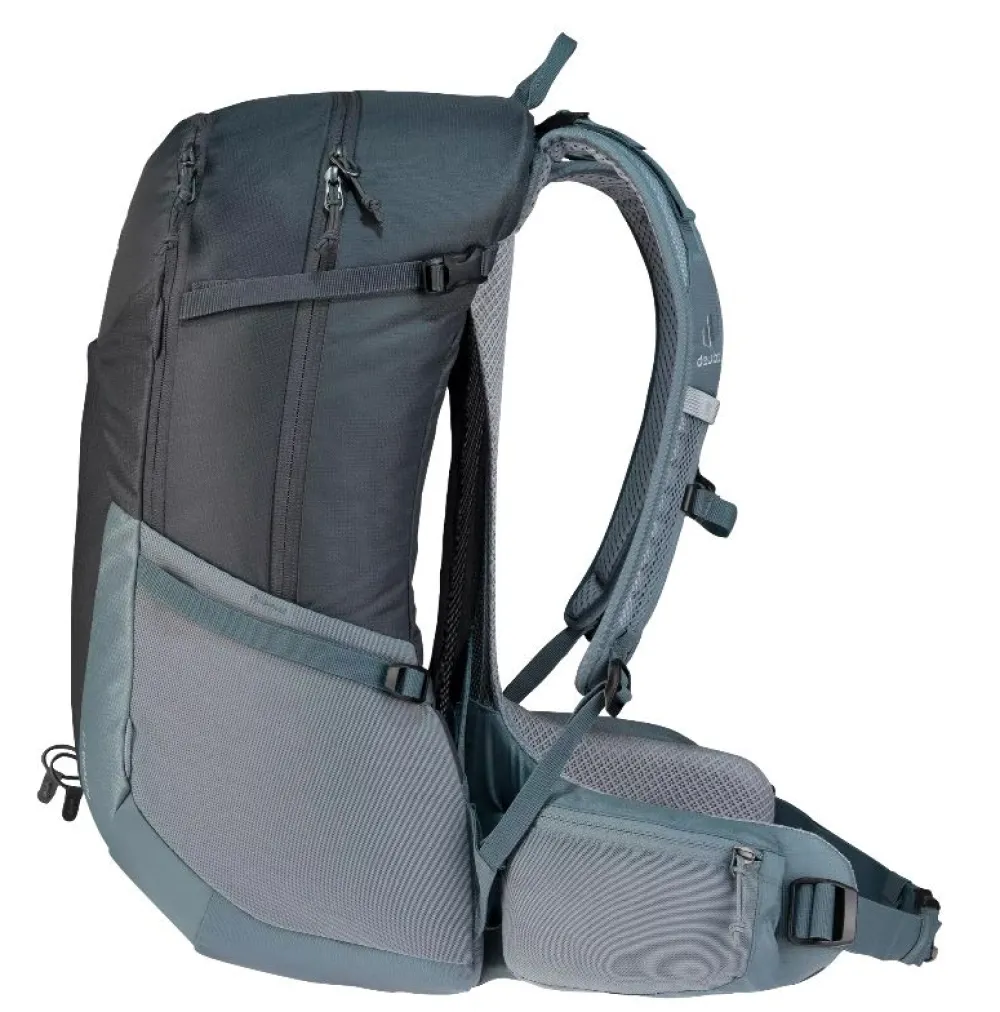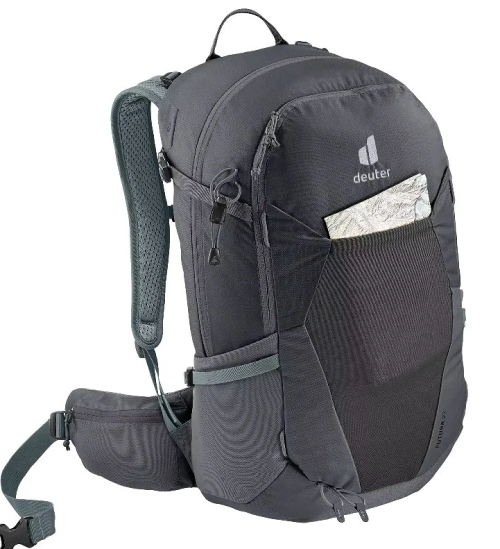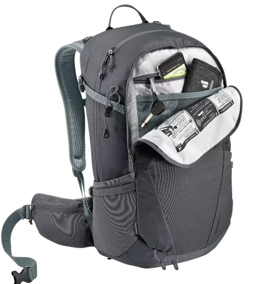 Zaino trekking Deuter Futura 26. Zaino ultra-leggero e compatto, realizzato in robusto 210 D PA riciclato. Tasca principale chiusa da patta, tasche laterali elastiche. Copertura pioggia amovibile. Schienale super confortevole e traspirante Aircomfort. Portabastone da escursione. Spallacci mobili Active Comfort Fit. Compatibile con sistema di idratazione (non incluso). Cintura sternale regolabile.
