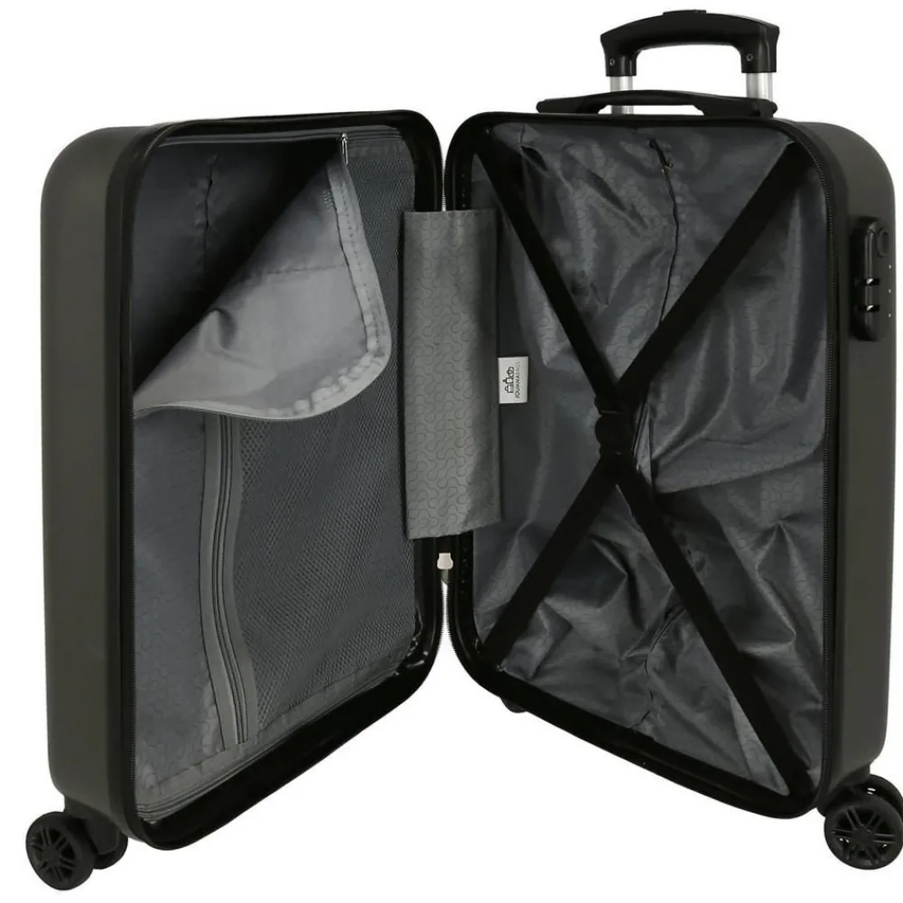 Trolley cabina Disney Mickey Outline. Trolley cabina realizzato in robusto ABS, quattro grandi e silenziose ruote piroettanti, zip di chiusura con sistema di sicurezza a tripla combinazione. Carrello di traino regolabile in altezza con push botton. Interno completamente foderato, con nastri per bloccare l’abbigliamento e divisorio. Garanzia 2 anni.