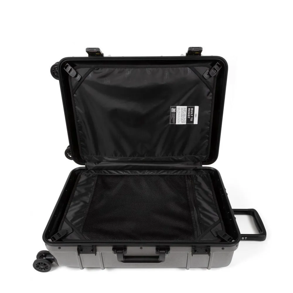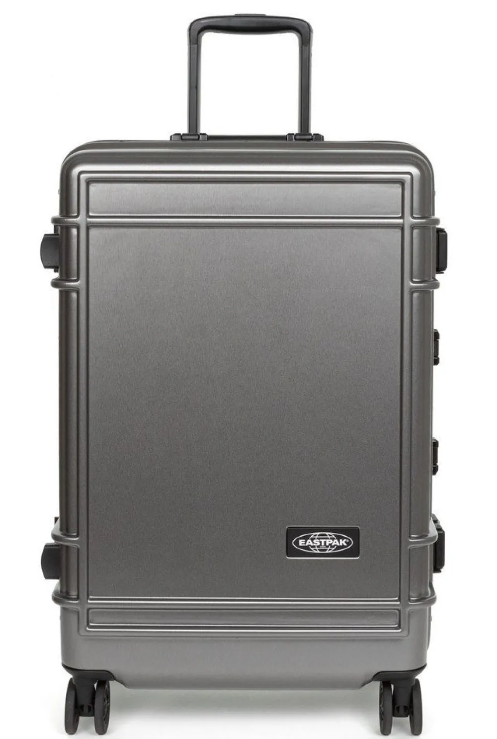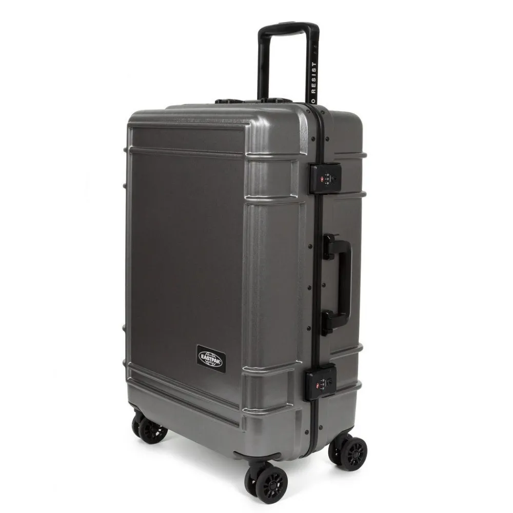 Trolley medio Eastpak Resist’R Case M. Trolley realizzato in robusto policarbonato con telaio in alluminio, quattro grandi e silenziose ruote piroettanti, robusti ganci di chiusura con sistema di sicurezza a tripla combinazione e TSA per gli Stati Uniti. Carrello di traino regolabile in altezza con push botton a chiusura attutita, maniglia di servizio laterale. Interno foderato con fosera logata Eastpak. Garanzia 30 anni.
