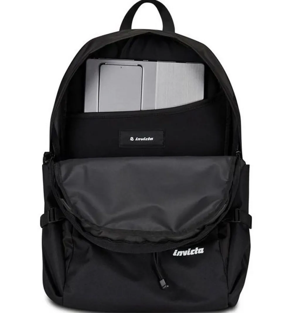 Zaino Invicta Invict-Act Plus. Zaino realizzato in robusto poliestere riciclato, due ampie tasche principali chiuse da zip, schienale imbottito e traspirante, spallacci gommati e sagomati. Vano interno gommato porta laptop/tabelt 14″. Ampia tasca frontale e tasche laterali, per bottiglia e ombrello. Nastri di compressione laterali e sistema elastico anteriore con inserti riflettenti.