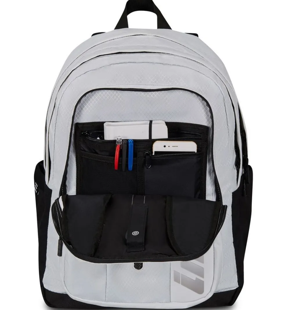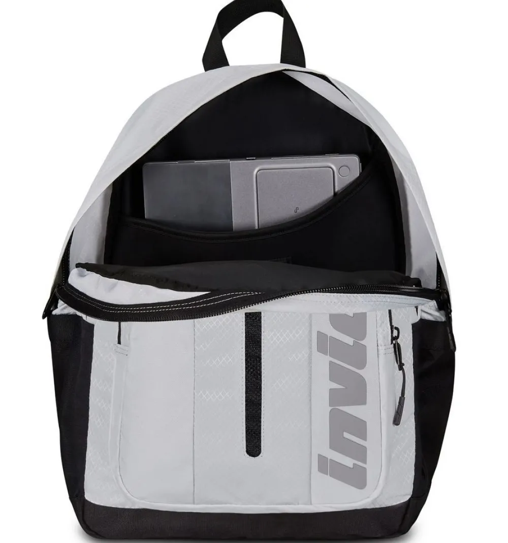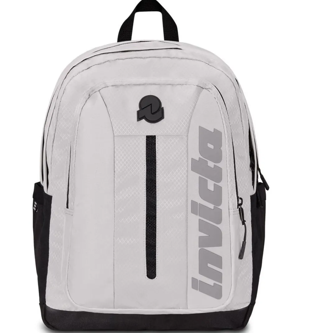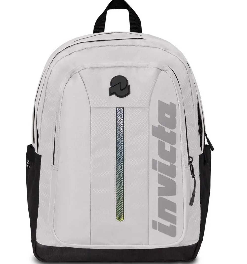 Zaino Invicta Invict-Act Plus Led. Zaino realizzato in robusto poliestere riciclato, due ampie tasche principali chiuse da zip, schienale imbottito e traspirante, spallacci gommati e sagomati. Vano interno gommato porta laptop/tabelt 14″. Ampia tasca frontale e tasche laterali, per bottiglia e ombrello. Nastri di compressione laterali e barra a Led frontale.