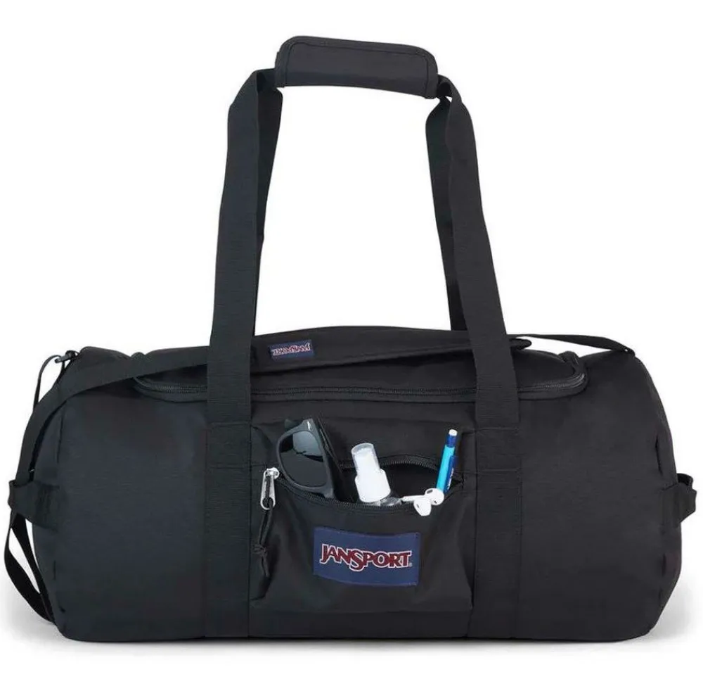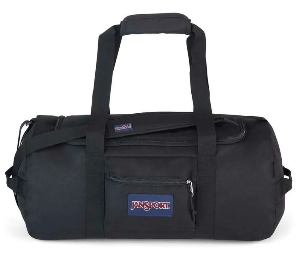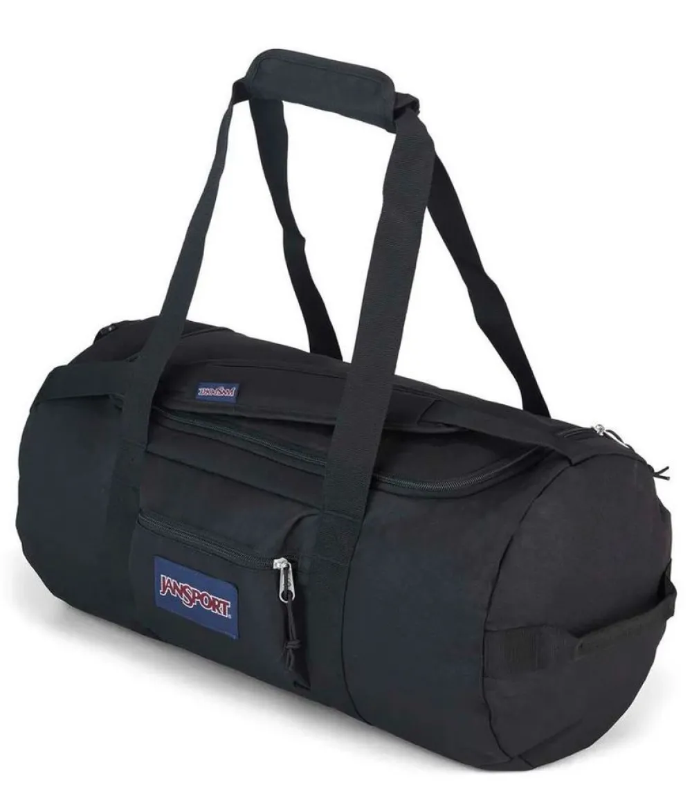 Borsone Jansport Superbreak Away Duffel 40. Realizzato in robusto poliestere riciclato, scomparto principale con ampia apertura, tracolla regolabile in lunghezza, tasca frontale.