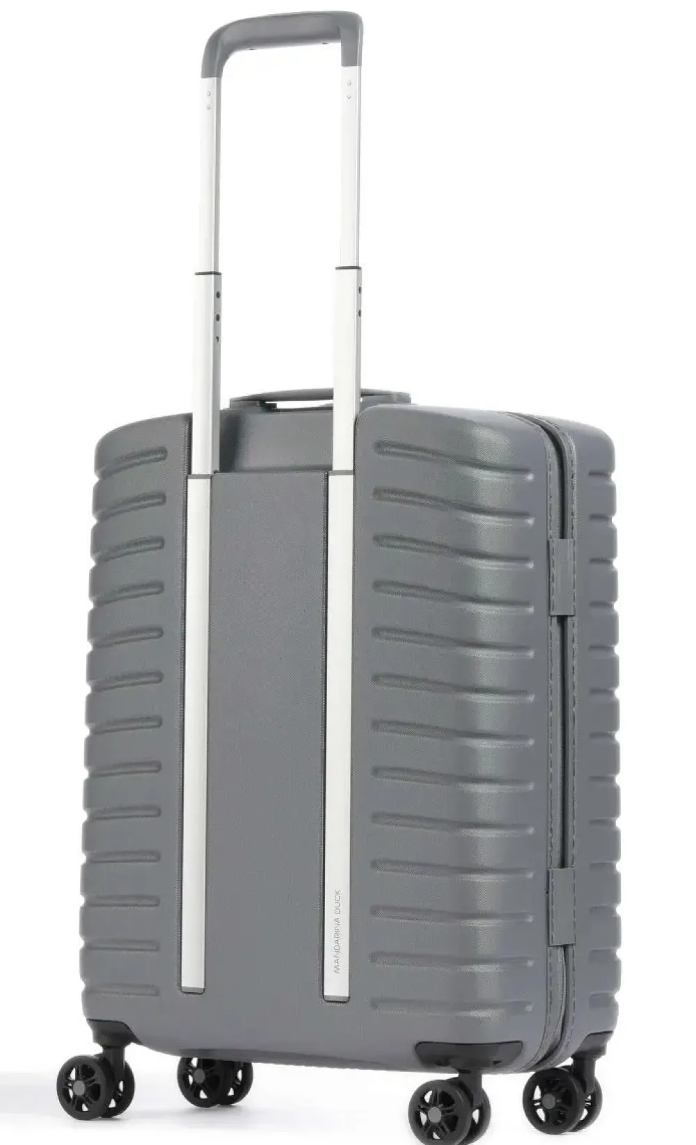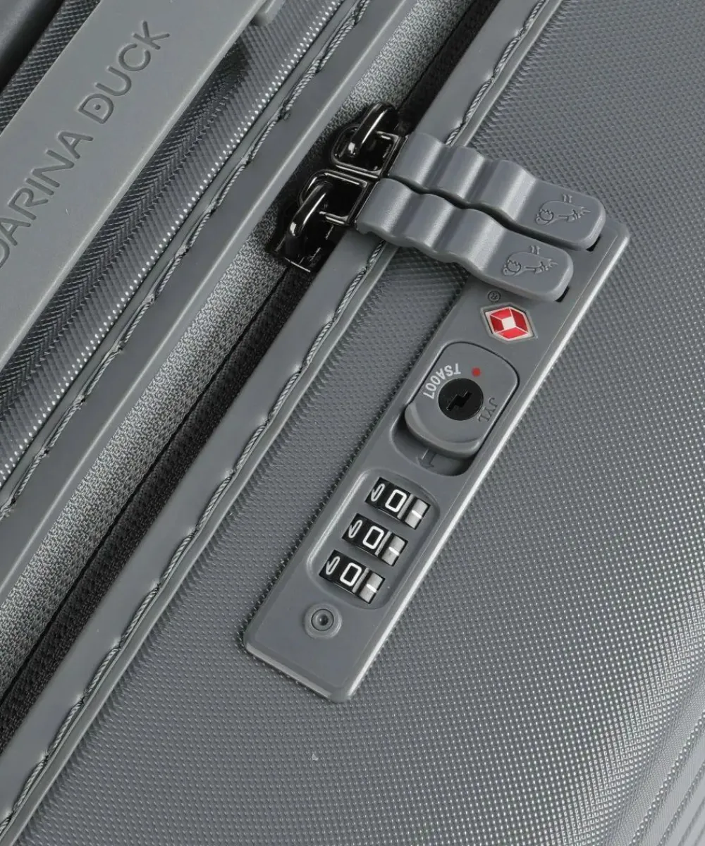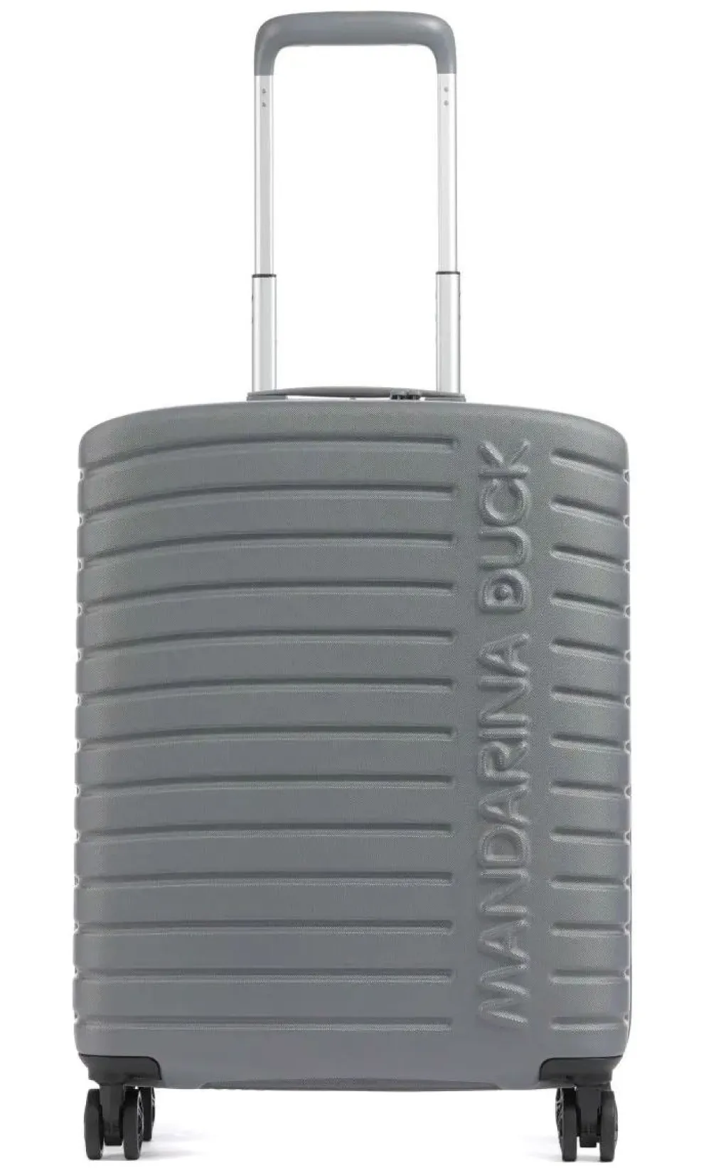 Trolley cabina Mandarina Duck Flyduck. Trolley cabina/bagaglio a mano realizzato in robusto policarbonato, quattro grandi e silenziose ruote gemellari piroettanti, zip di chiusura con sistema di sicurezza a tripla combinazione e TSA per gli Stati Uniti. Carrello di traino regolabile in altezza con push botton. Interno completamente foderato, con nastri per bloccare l’abbigliamento e divisorio. Garanzia 5 anni.