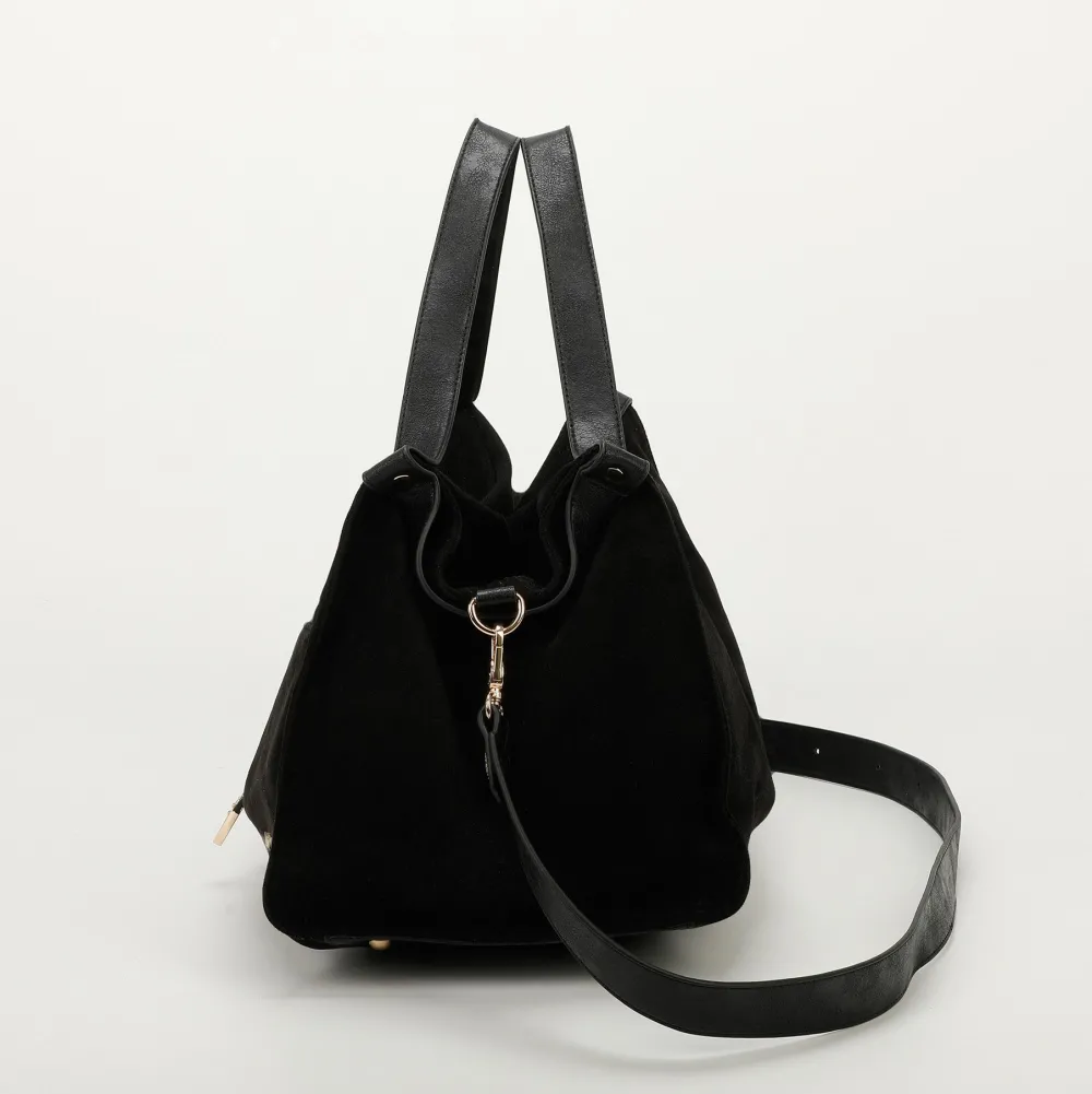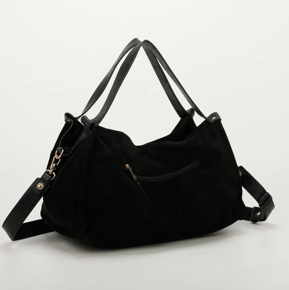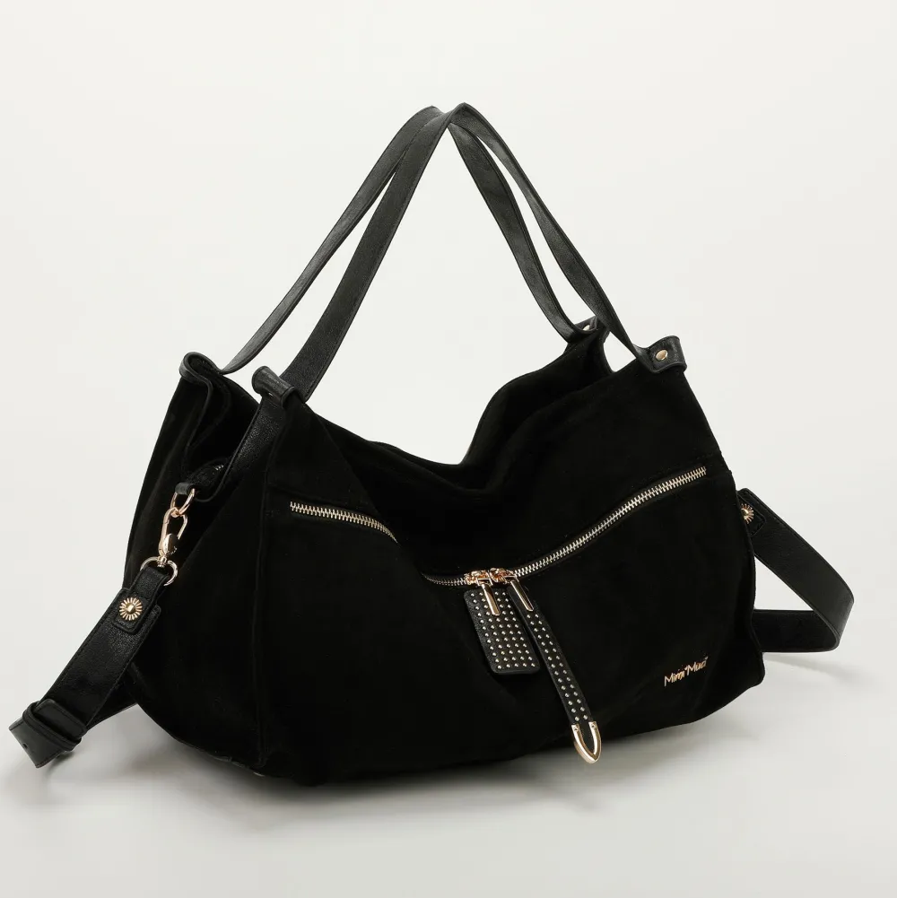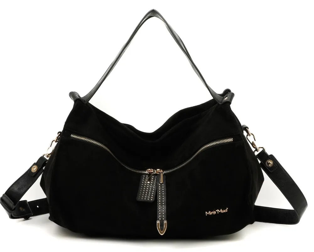 Borsa a spalla e tracolla Mimì-Muà . Borsa realizzata in robusto materiale sintetico, ampia tasca principale chiusa da zip, con tasche interne per piccoli oggetti. Tasca posteriore chiusa da zip. Tracolla amovibile e regolabile in lunghezza.