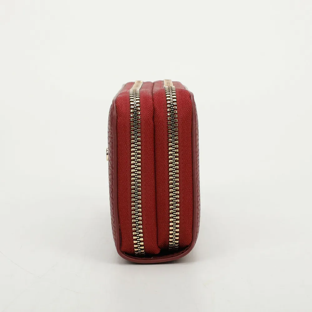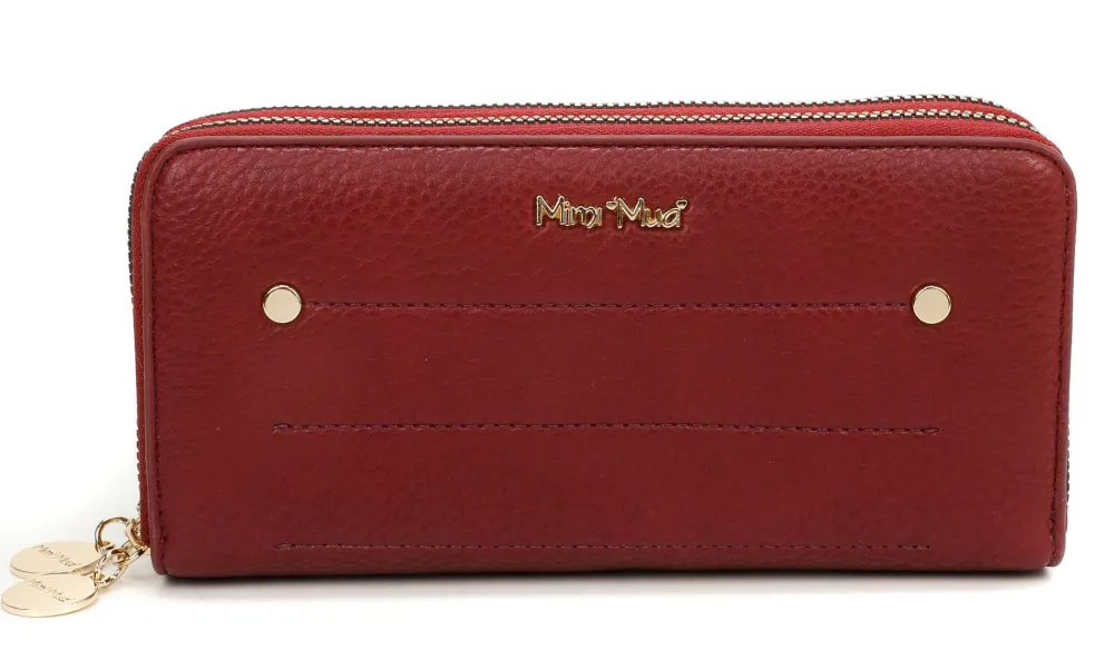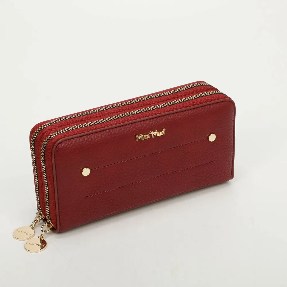 Portafoglio donna 2-zip Mimì-Muà . Realizzato in robusta pelle sintetica, due ampie tasche principali chiuse da zip con vano per banconote e tasca chiusa da zip per monete.