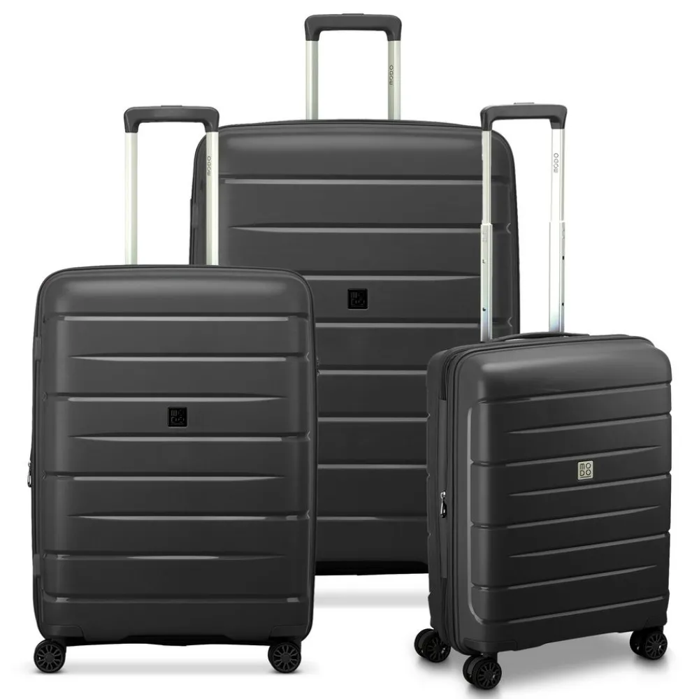 Set 3 Trolley MODO by Roncato Starlight 3.0. Trolley realizzato in polipropilene ultraleggero, 4 grandi ruote doppie piroettanti, carrello di traino telescopico con push botton, chiusura a tripla combinazione con sistema TSA per gli Stati Uniti. Interno completamente foderato, con divisorio, nastri per bloccare gli indumenti e tasche per piccoli oggetti. Zip di espansione.