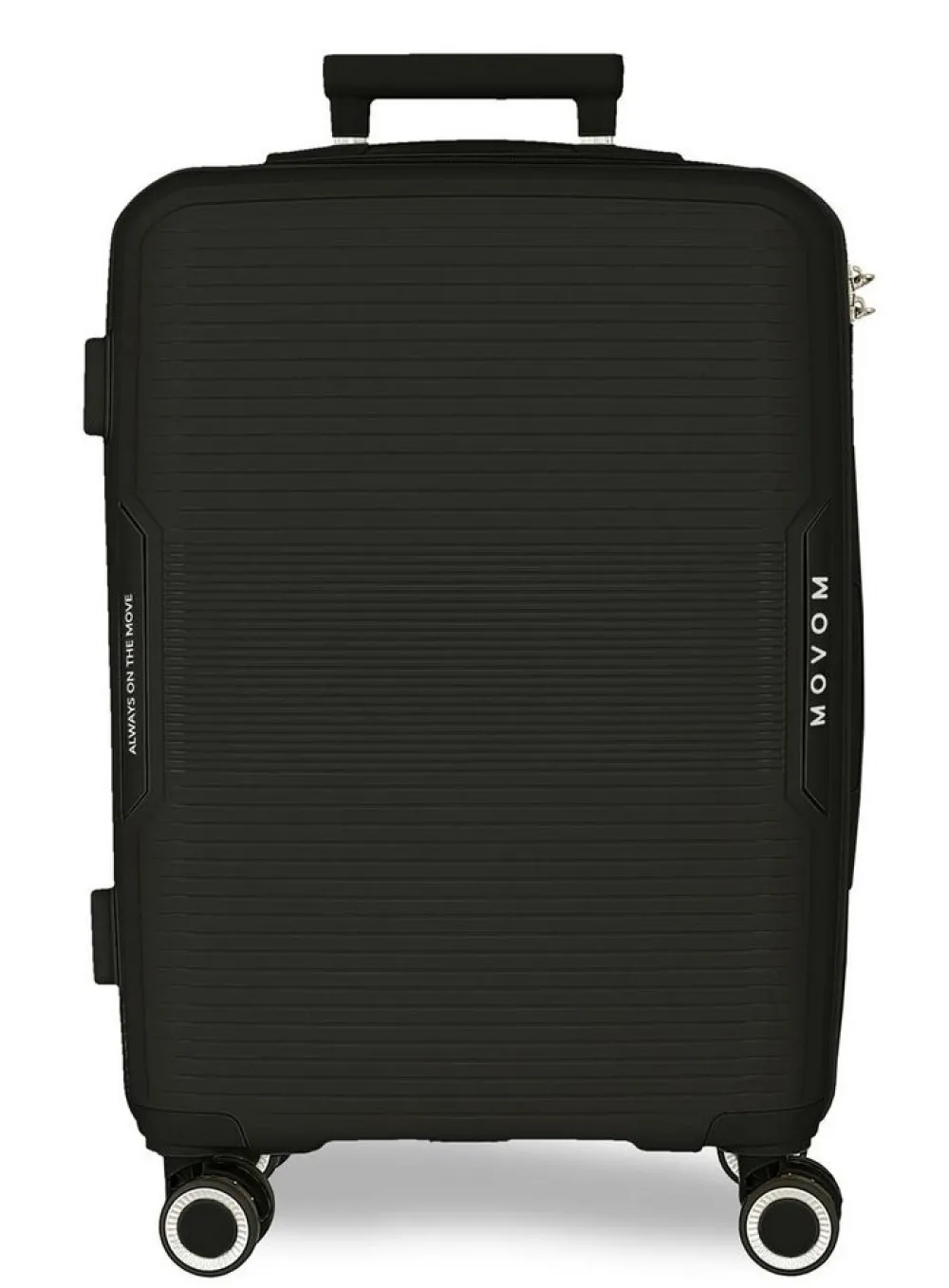 Trolley cabina Movom Inari. Trolley cabina/bagaglio a mano realizzato in robusto polipropilene, quattro grandi e silenziose ruote gemellari piroettanti, zip di chiusura con sistema di sicurezza a tripla combinazione e TSA per gli Stati Uniti. Carrello di traino regolabile in altezza con push botton. Interno completamente foderato, con nastri per bloccare l’abbigliamento, divisorio e tasca per piccoli oggetti. Garanzia 2 anni.