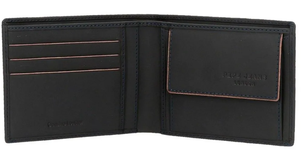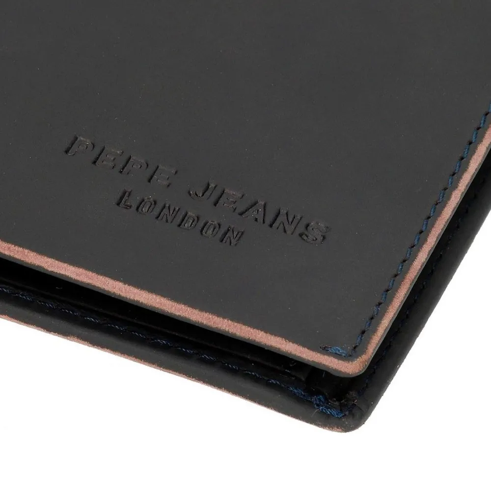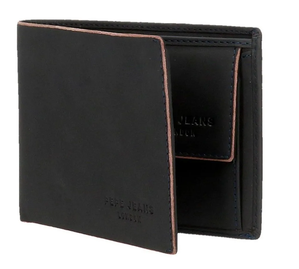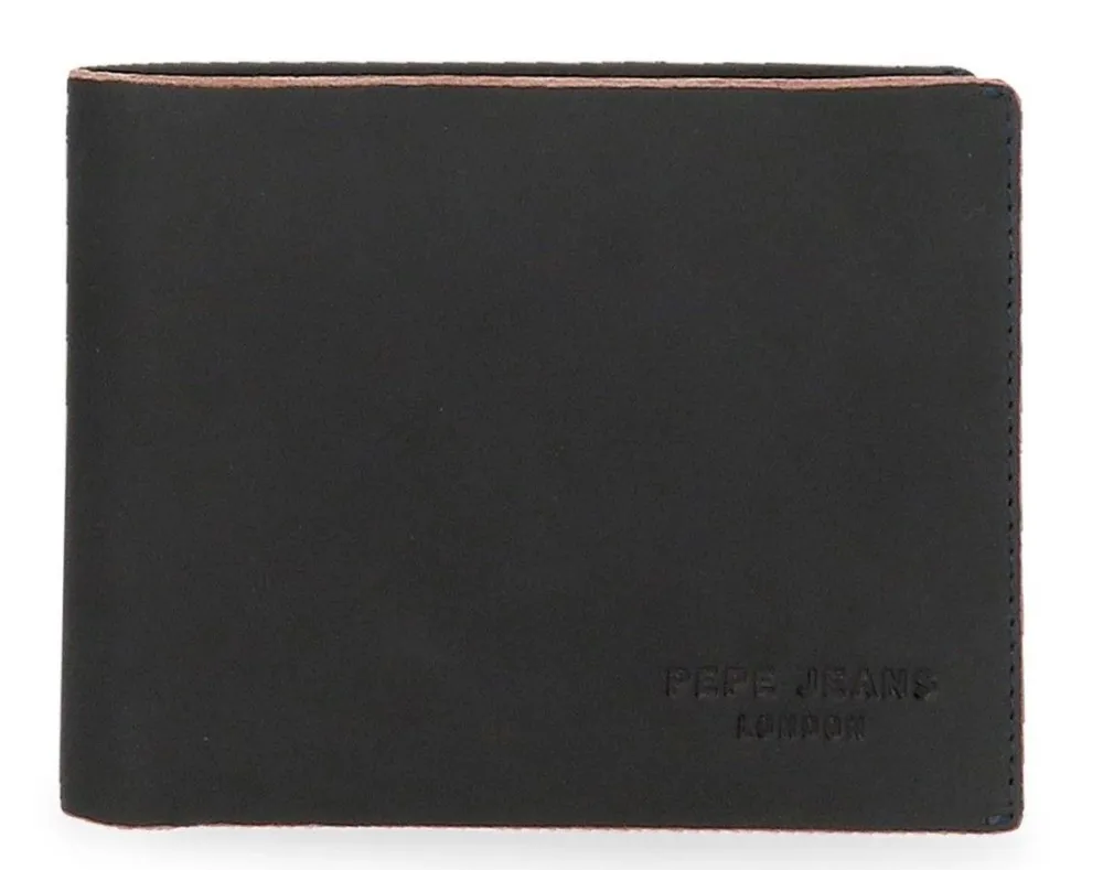 Portafoglio uomo Pepe Jeans Scraped 74742. Portafoglio in vera pelle organizzato con doppio vano portabanconote, tasca portamonete chiusa da bottone, porta carte di credito. Protezione RFID per bancomat e carte di credito. Logo frontale Pepe Jeans.