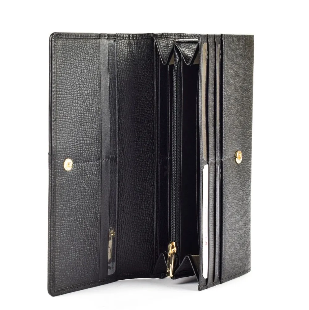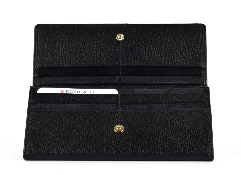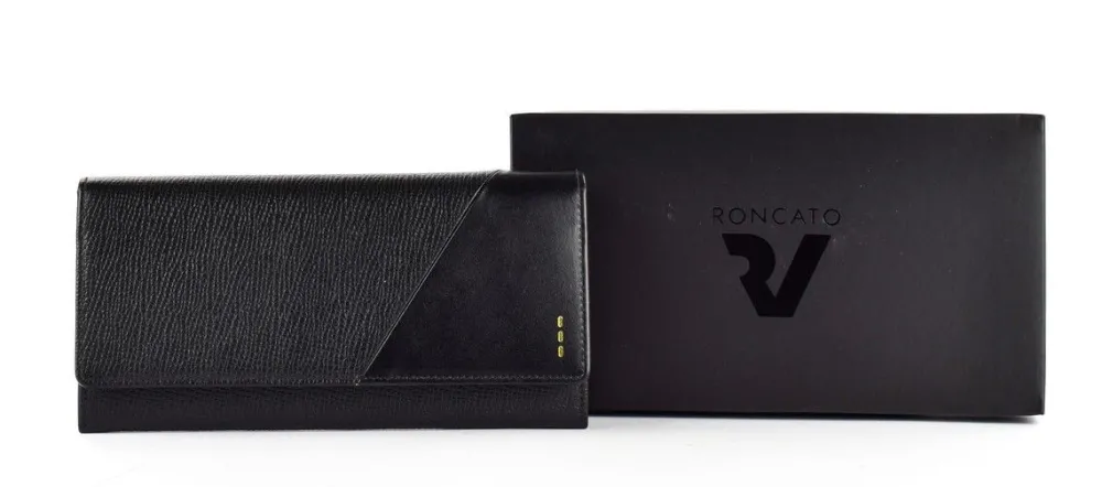Portafoglio donna Roncato Milano 623. Portafoglio realizzato in vera pelle bovina. Ampia tasca principale chiusa da bottone, con tasca portamonete interna e vani portadocumenti e porta carte di credito. Logo Roncato frontale.