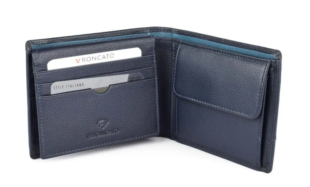 Portafoglio uomo in pelle Roncato Alaska 2410. Realizzato in pelle di alta qualità , con vano portadocumenti, tasca portamonete chiusa da bottone, ribalta portadocumenti e doppio vano portabanconote. Schermatura RFID
