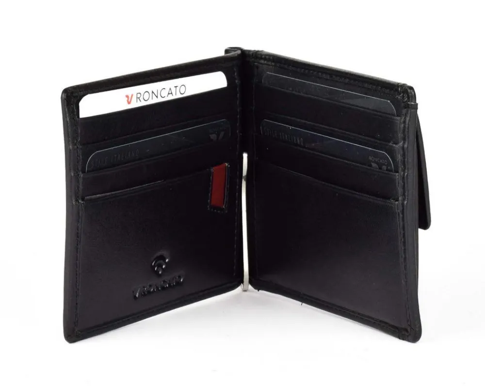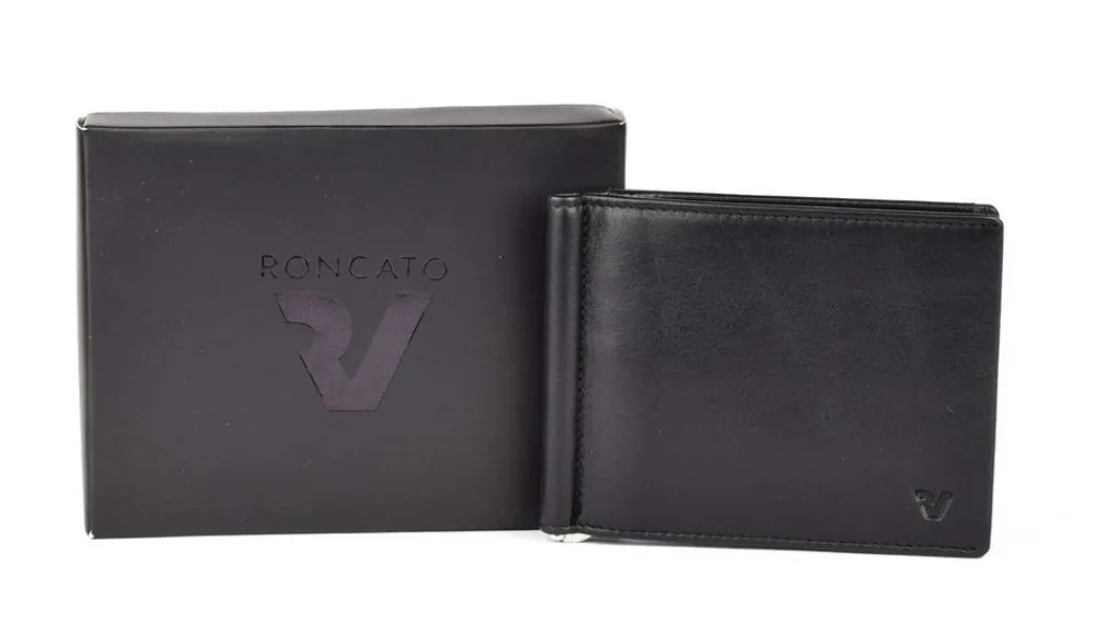 Portafoglio uomo fermasoldi a molla Roncato Pascal 2913. Portafoglio realizzato in vera pelle di alta qualità , con molla interna ferma soldi e vani porta carte di credito sui due frontali. Tasca esterna porta monete chiusa da zip. Schermatura RFID.
