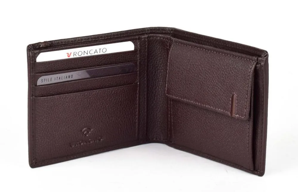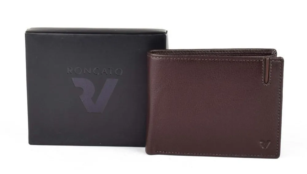 Portafoglio uomo piccolo Roncato Liverpool 1042. Realizzato in pelle di alta qualità , con vano portadocumenti, tasca portamonete chiusa da bottone e doppio vano portabanconote. Schermatura RFID