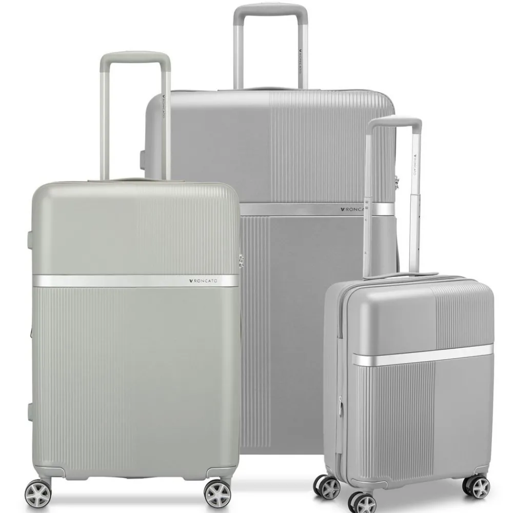 Set 3 Trolley espandibili Roncato AirGlam. Trolley realizzato in robusto policarbonato/ABS, 4 ruote doppie piroettanti per la massima manovrabilità , carrello di traino telescopico con push botton, chiusura a tripla combinazione con sistema TSA per gli Stati Uniti, zip di espansione che consente di aumentare la capacità a seconda delle necessità . Interno completamente foderato con divisorio e nastri per bloccare l’abbigliamento. Garanzia 3 anni.