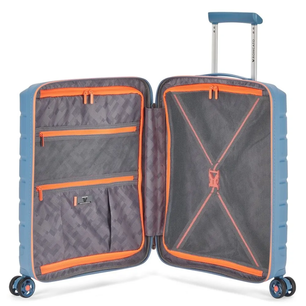 Trolley cabina Roncato B-Flying Neon 7983. Trolley cabina/bagaglio a mano realizzato in robusto polipropilene 100% riciclabile, quattro grandi e silenziose ruote gemellari piroettanti, zip di chiusura con sistema di sicurezza a tripla combinazione e TSA per gli Stati Uniti. Carrello di traino regolabile in altezza con push botton. Interno completamente foderato, con nastri per bloccare l’abbigliamento, divisorio e tasche per piccoli oggetti. Cerniera water resistant. Garanzia 5 anni.