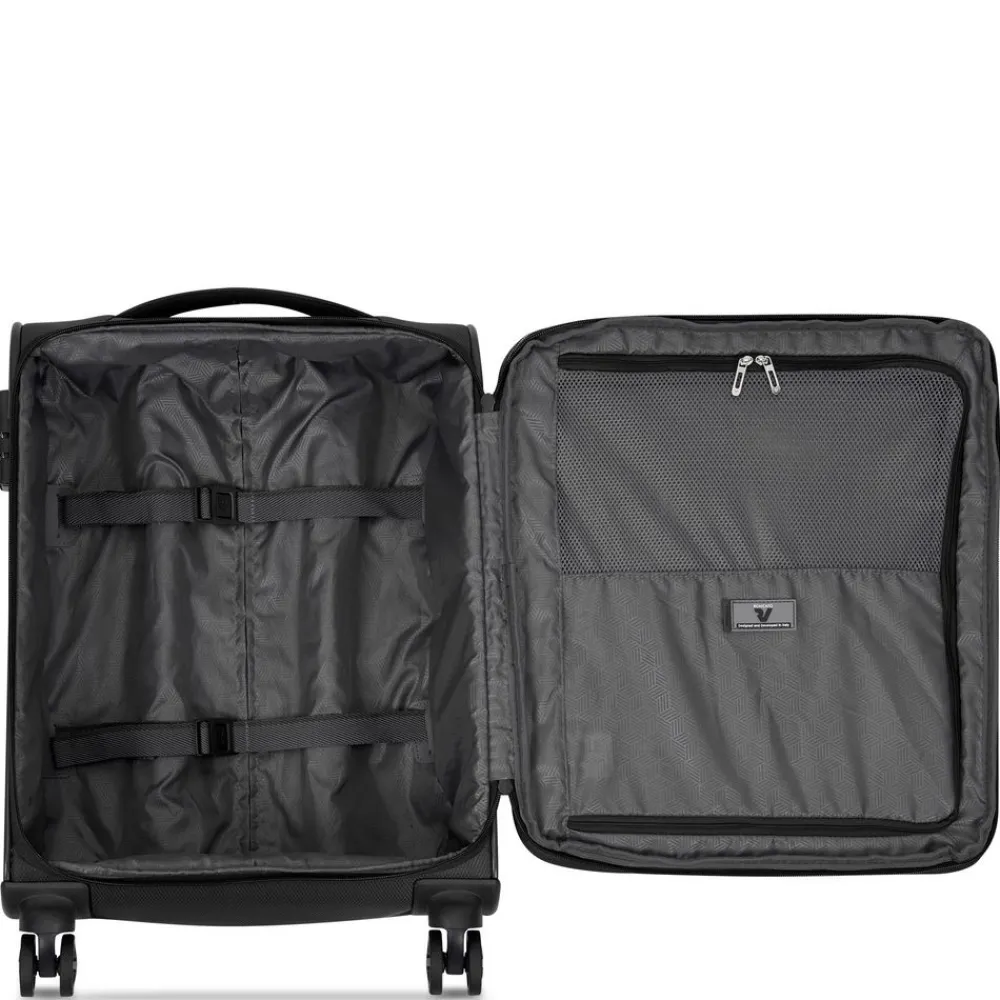 Trolley cabina Roncato Jazz 4.0 4643. Trolley realizzato in robusto poliestere, carrello di traino telescopico con push botton, 4 grandi ruote gemellari integrate. Tasca frontale chiusa da zip, maniglia di servizio superiore, zip di espansione che consente di aumentare la capacità a seconda delle necessità , chiusura a tripla combinazione con sistema TSA per gli Stati Uniti. Internamente organizzato con divisorio e nastri per bloccare l’abbigliamento. Le misure lo rendono il bagaglio a mano ideale per la maggior parte delle compagnie aeree. Garanzia 2 anni.