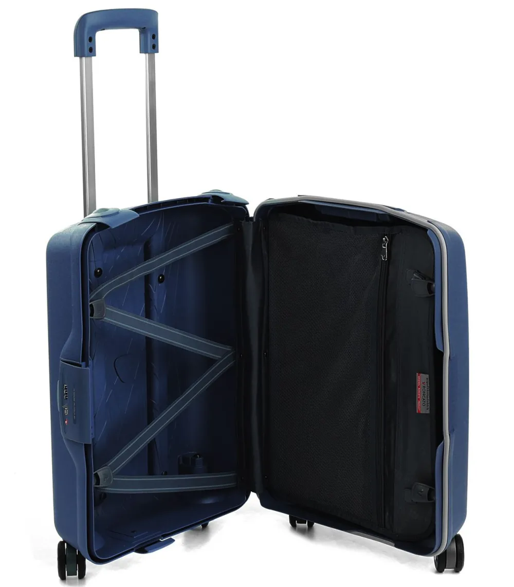 Trolley Roncato Light 4 ruote cabina art 714. Trolley in polipropilene ultraleggero realizzato interamente in Italia, con maniglia di traino integrata, 4 ruote piroettanti, maniglia superiore integrata, interno accessoriato con divisorio e tasche per piccoli oggetti, sistema di sicurezza altamente resistente (composto da 3 chiusure con blocco di sicurezza e una combinazione centrale dotata di sistema TSA per i Vostri viaggi negli Stati Uniti). I motivi grafici sul frontale del trolley ricordano una ragnatela e sono il frutto di una ricerca specifica da parte dell’azienda produttrice. Durante il processo produttivo il polipropilene viene iniettato all’interno dello stampo in maniera sequenziale, riducendo così lo spessore della plastica (e quindi il peso) e garantendo grandi doti di elasticità e resistenza. Un occhio attento anche alla salvaguardia dell’ambiente. Il trolley è riciclabile al 100% ed è costruito utilizzando un sistema di produzione e assemblaggio studiato per ridurre l’emissione di CO2 nell’ambiente. Test effettuati sul prodotto: Test di caduta : a pieno carico – Test di tamburo : 20 rotazioni a pieno carico – Ruote : 32.000m a pieno carico – Serrature : 7.500 aperture/chiusure – Maniglie : 5000 cicli a pieno carico