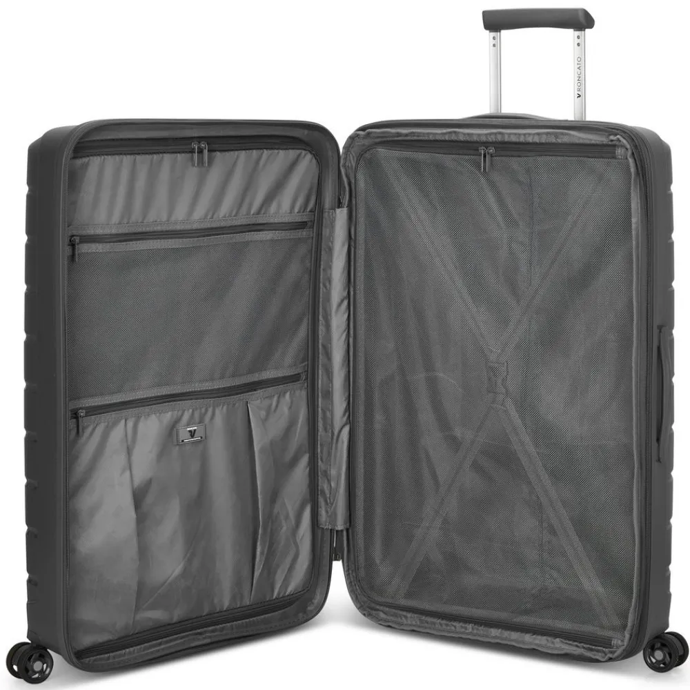 Trolley espandibile Roncato B-Flying grande 8181. Trolley realizzato in robusto Polipropilene ultraleggero, 4 ruote doppie piroettanti per la massima manovrabilità , carrello di traino telescopico con push botton, chiusura a tripla combinazione con sistema TSA per gli Stati Uniti, zip di espansione che consente di aumentare la capacità a seconda delle necessità . Interno completamente foderato con divisorio e tasche per piccoli oggetti. Garanzia 2 anni.