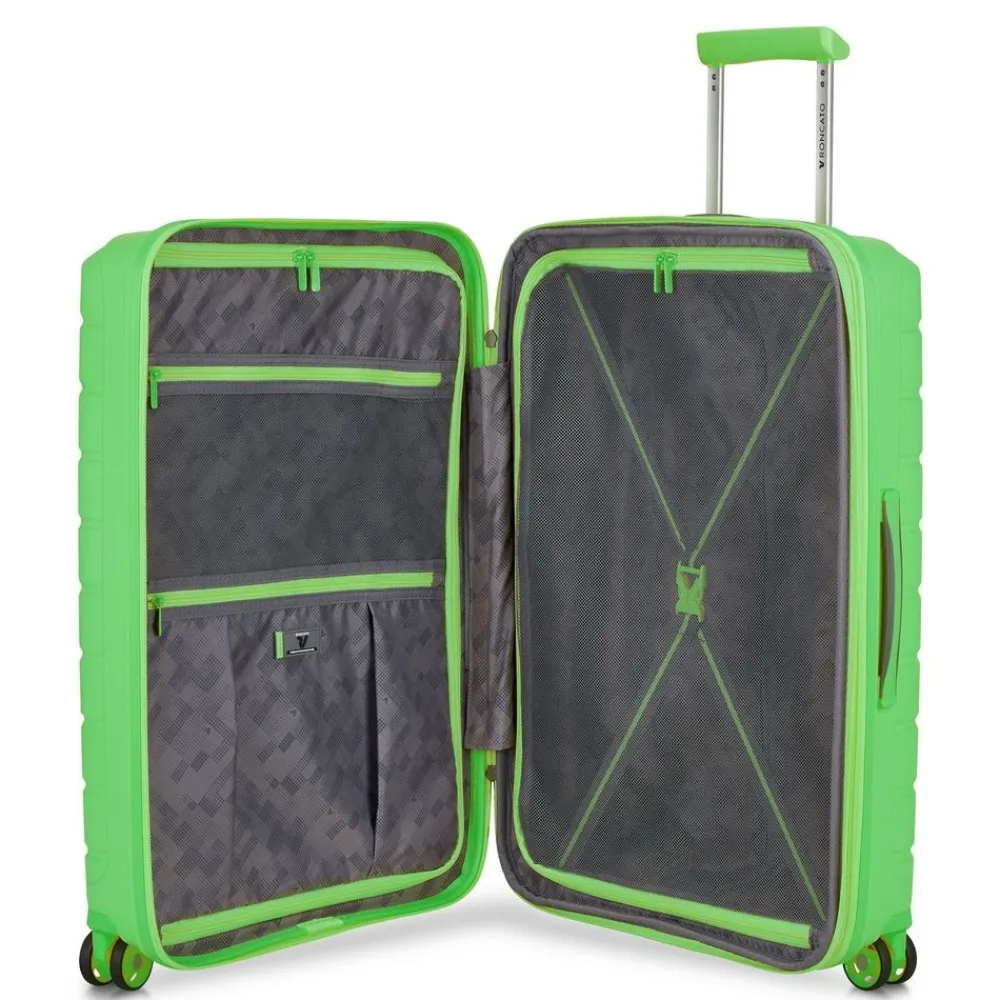 Trolley espandibile Roncato B-Flying medio 8182. Trolley realizzato in robusto Polipropilene ultraleggero, 4 ruote doppie piroettanti per la massima manovrabilità , carrello di traino telescopico con push botton, chiusura a tripla combinazione con sistema TSA per gli Stati Uniti, zip di espansione che consente di aumentare la capacità a seconda delle necessità . Interno completamente foderato con divisorio e tasche per piccoli oggetti. Garanzia 2 anni.