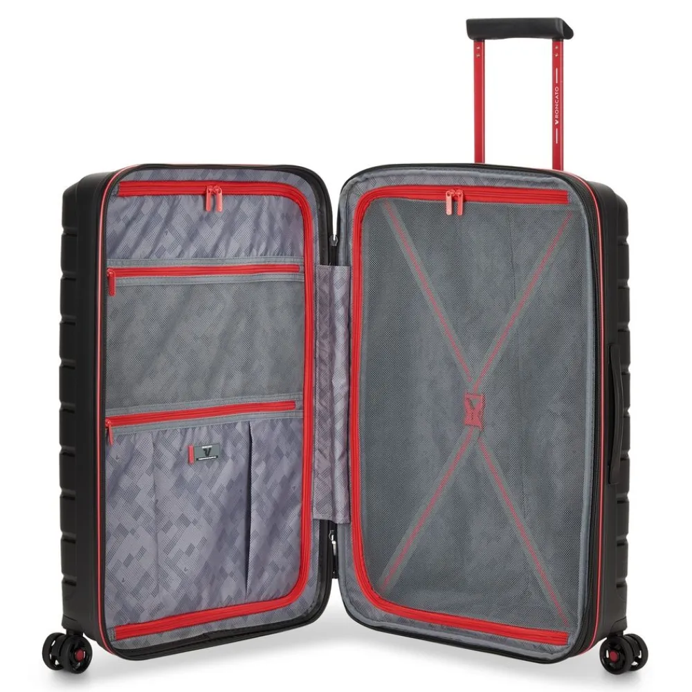 Trolley espandibile Roncato B-Flying medio 8182. Trolley realizzato in robusto Polipropilene ultraleggero, 4 ruote doppie piroettanti per la massima manovrabilità , carrello di traino telescopico con push botton, chiusura a tripla combinazione con sistema TSA per gli Stati Uniti, zip di espansione che consente di aumentare la capacità a seconda delle necessità . Interno completamente foderato con divisorio e tasche per piccoli oggetti. Garanzia 2 anni.