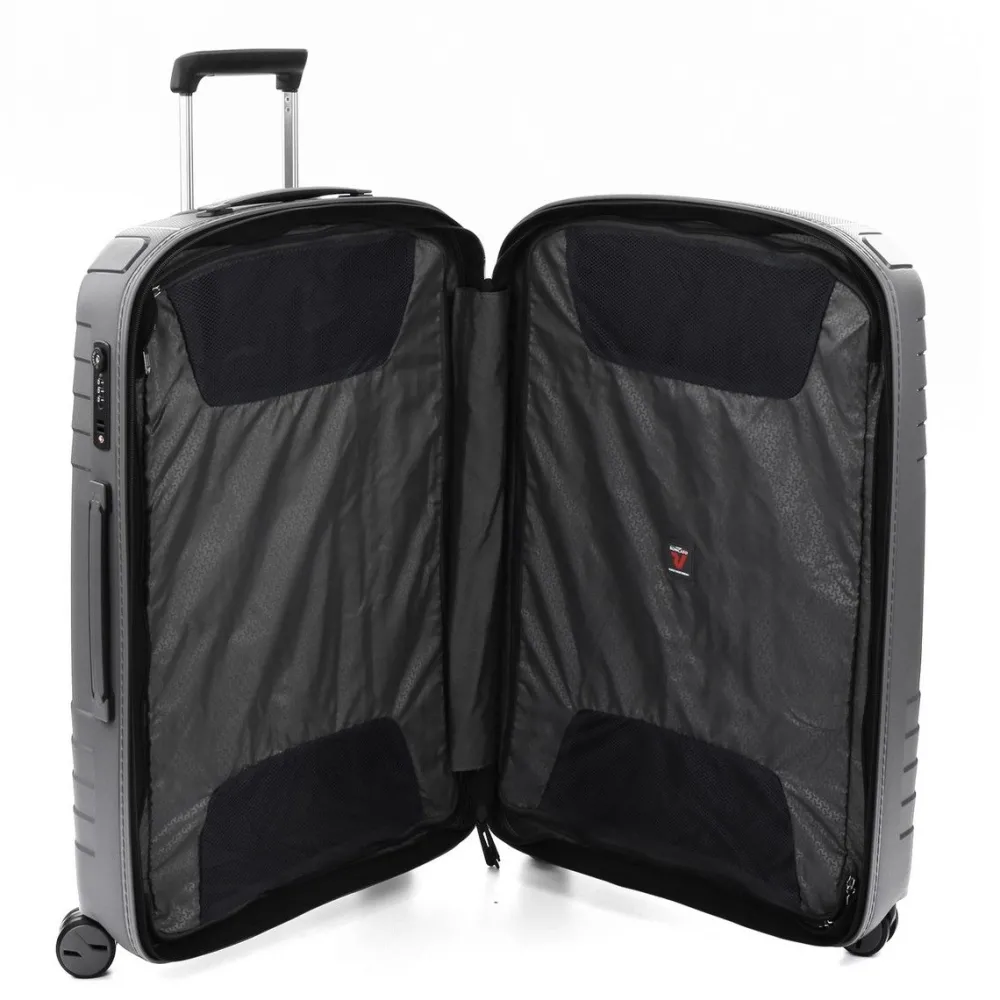 Trolley espandibile Roncato Ypsilon grande 5761 – Made in Italy. Trolley realizzato in robusto polipropilene ultraleggero, carrello telescopico con push botton, 4 ruote piroettanti doppie. Zip di chiusura anti-effrazione, per una maggiore protezione del contenuto della valigia. Chiusura integrata con tripla combinazione TSA per gli Stati Uniti. Interno completamente foderato e sfoderabile. Zip di espansione, che consente di aumentare la capacità in caso di bisogno. Garanzia 10 anni.