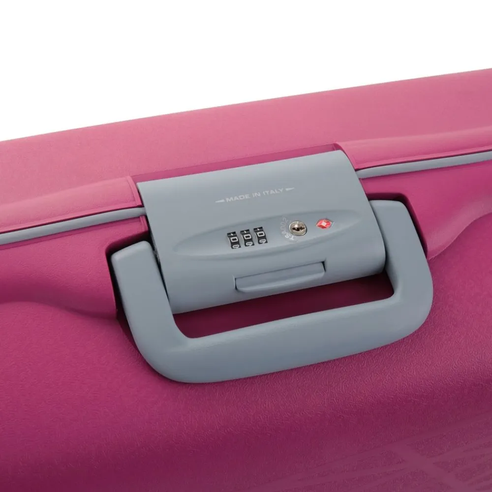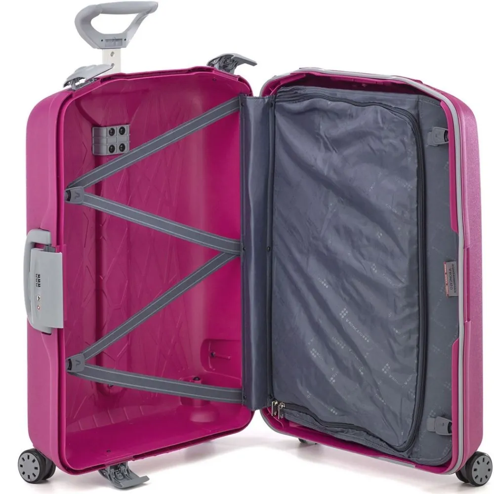 Trolley Roncato Light 4 ruote grande. Trolley in polipropilene ultraleggero realizzato interamente in Italia, con maniglia di traino integrata con sistema “push botton”, 4 ruote piroettanti, maniglia superiore integrata, interno accessoriato con divisorio, sistema di sicurezza altamente resistente (composto da 3 chiusure con blocco di sicurezza e una combinazione centrale dotata di sistema TSA per i Vostri viaggi negli Stati Uniti).I motivi grafici sul frontale del trolley ricordano una ragnatela e sono il frutto di una ricerca specifica da parte dell’azienda produttrice. Durante il processo produttivo il polipropilene viene iniettato all’interno dello stampo in maniera sequenziale, riducendo così lo spessore della plastica (e quindi il peso) e garantendo grandi doti di elasticità e resistenza. Un occhio attento anche alla salvaguardia dell’ambiente. Il trolley è riciclabile al 100% ed è costruito utilizzando un sistema di produzione e assemblaggio studiato per ridurre l’emissione di CO2 nell’ambiente. Test effettuati sul prodotto: Test di caduta : a pieno carico – Test di tamburo : 20 rotazioni a pieno carico – Ruote : 32.000m a pieno carico – Serrature : 7.500 aperture/chiusure – Maniglie : 5000 cicli a pieno carico