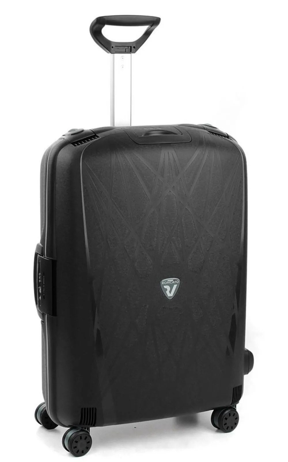 Trolley Roncato Light 4 ruote medio. Trolley in polipropilene ultraleggero realizzato interamente in Italia, con maniglia di traino integrata con sistema “push botton”, 4 ruote piroettanti, maniglia superiore integrata, interno accessoriato con divisorio e tasche per piccoli oggetti, sistema di sicurezza altamente resistente (composto da 3 chiusure con blocco di sicurezza e una combinazione centrale dotata di sistema TSA per i Vostri viaggi negli Stati Uniti). I motivi grafici sul frontale del trolley ricordano una ragnatela e sono il frutto di una ricerca specifica da parte dell’azienda produttrice. Durante il processo produttivo il polipropilene viene iniettato all’interno dello stampo in maniera sequenziale, riducendo così lo spessore della plastica (e quindi il peso) e garantendo grandi doti di elasticità e resistenza. Un occhio attento anche alla salvaguardia dell’ambiente. Il trolley è riciclabile al 100% ed è costruito utilizzando un sistema di produzione e assemblaggio studiato per ridurre l’emissione di CO2 nell’ambiente. Test effettuati sul prodotto: Test di caduta : a pieno carico – Test di tamburo : 20 rotazioni a pieno carico – Ruote : 32.000m a pieno carico – Serrature : 7.500 aperture/chiusure – Maniglie : 5000 cicli a pieno caricoÂ
