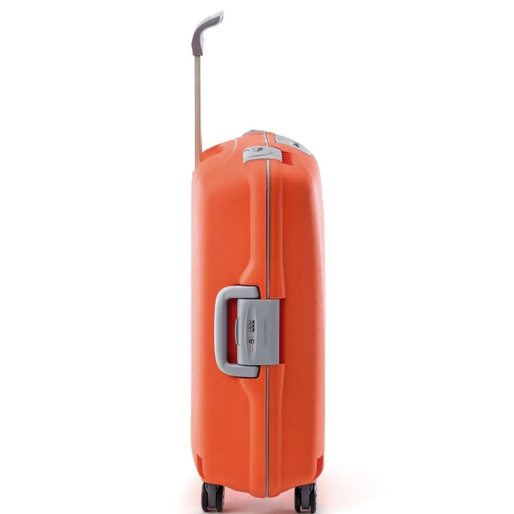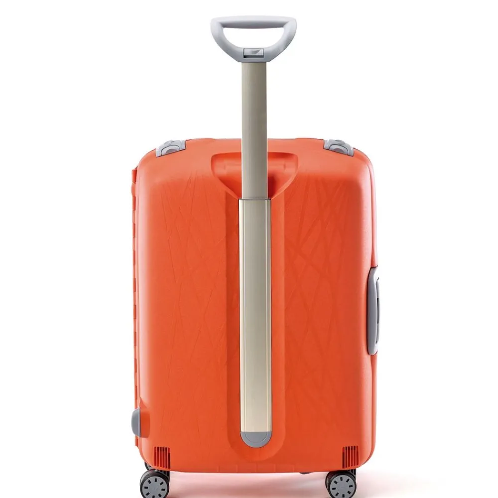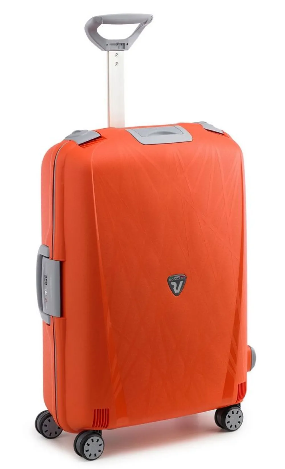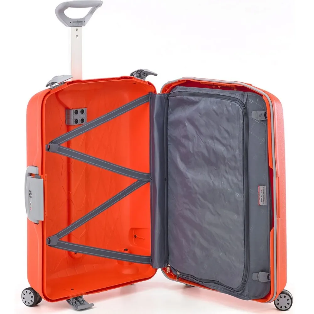 Trolley Roncato Light 4 ruote medio. Trolley in polipropilene ultraleggero realizzato interamente in Italia, con maniglia di traino integrata con sistema “push botton”, 4 ruote piroettanti, maniglia superiore integrata, interno accessoriato con divisorio e tasche per piccoli oggetti, sistema di sicurezza altamente resistente (composto da 3 chiusure con blocco di sicurezza e una combinazione centrale dotata di sistema TSA per i Vostri viaggi negli Stati Uniti). I motivi grafici sul frontale del trolley ricordano una ragnatela e sono il frutto di una ricerca specifica da parte dell’azienda produttrice. Durante il processo produttivo il polipropilene viene iniettato all’interno dello stampo in maniera sequenziale, riducendo così lo spessore della plastica (e quindi il peso) e garantendo grandi doti di elasticità e resistenza. Un occhio attento anche alla salvaguardia dell’ambiente. Il trolley è riciclabile al 100% ed è costruito utilizzando un sistema di produzione e assemblaggio studiato per ridurre l’emissione di CO2 nell’ambiente. Test effettuati sul prodotto: Test di caduta : a pieno carico – Test di tamburo : 20 rotazioni a pieno carico – Ruote : 32.000m a pieno carico – Serrature : 7.500 aperture/chiusure – Maniglie : 5000 cicli a pieno caricoÂ
