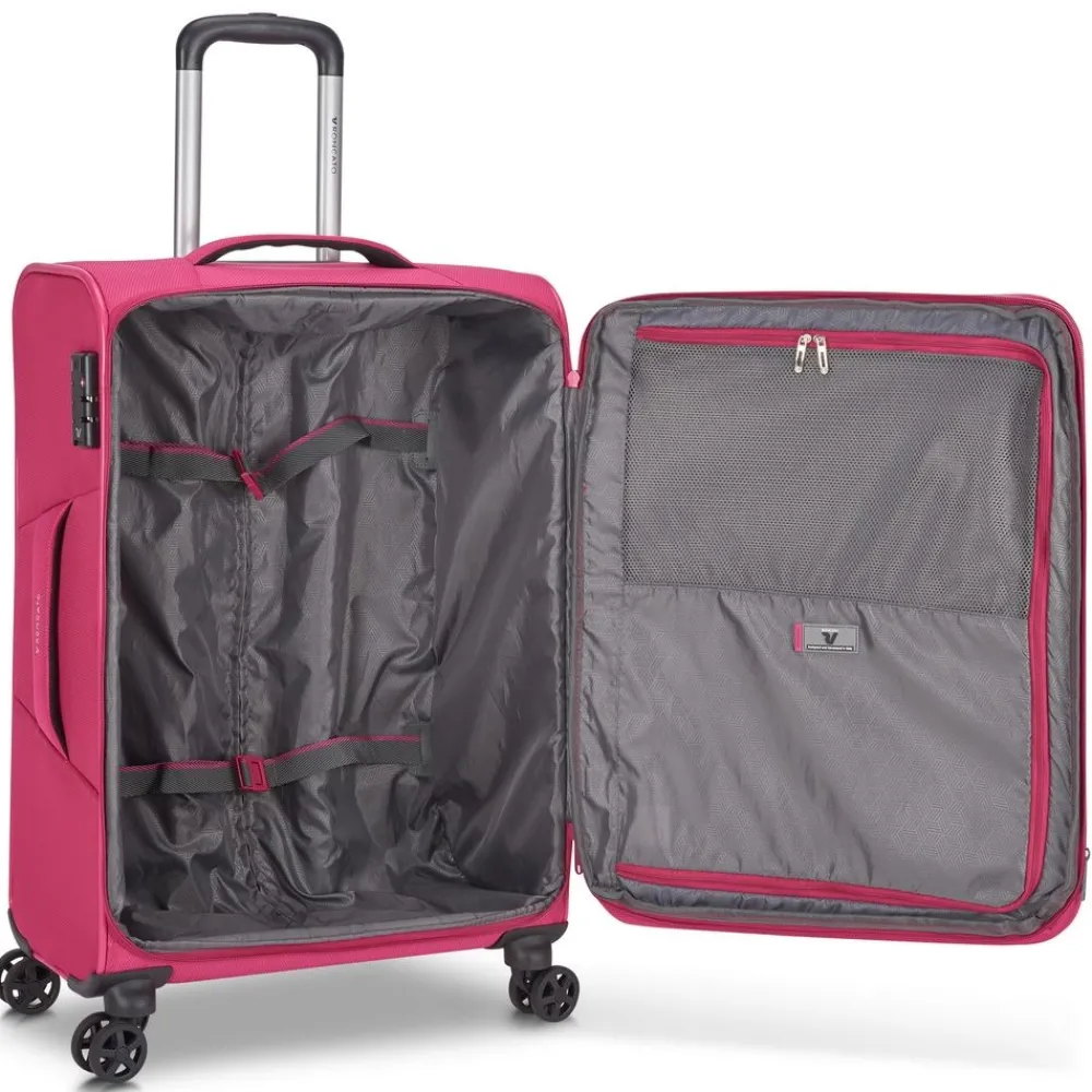 Trolley medio Roncato Jazz 4.0 4642. Trolley realizzato in robusto poliestere, 4 grandi ruote gemellari piroettanti per la massima scorrevolezza, carrello di traino in alluminio con push botton, tasca frontale chiusa da zip, maniglia di servizio superiore e laterale. Sistema di chiusura a tripla combinazione con sistema TSA per gli Stati Uniti. Zip di espansione che consente di aumentare la capacità a seconda delle necessità ! Internamente organizzato con nastri per bloccare l’abbigliamento e divisorio. Garanzia 2 anni.