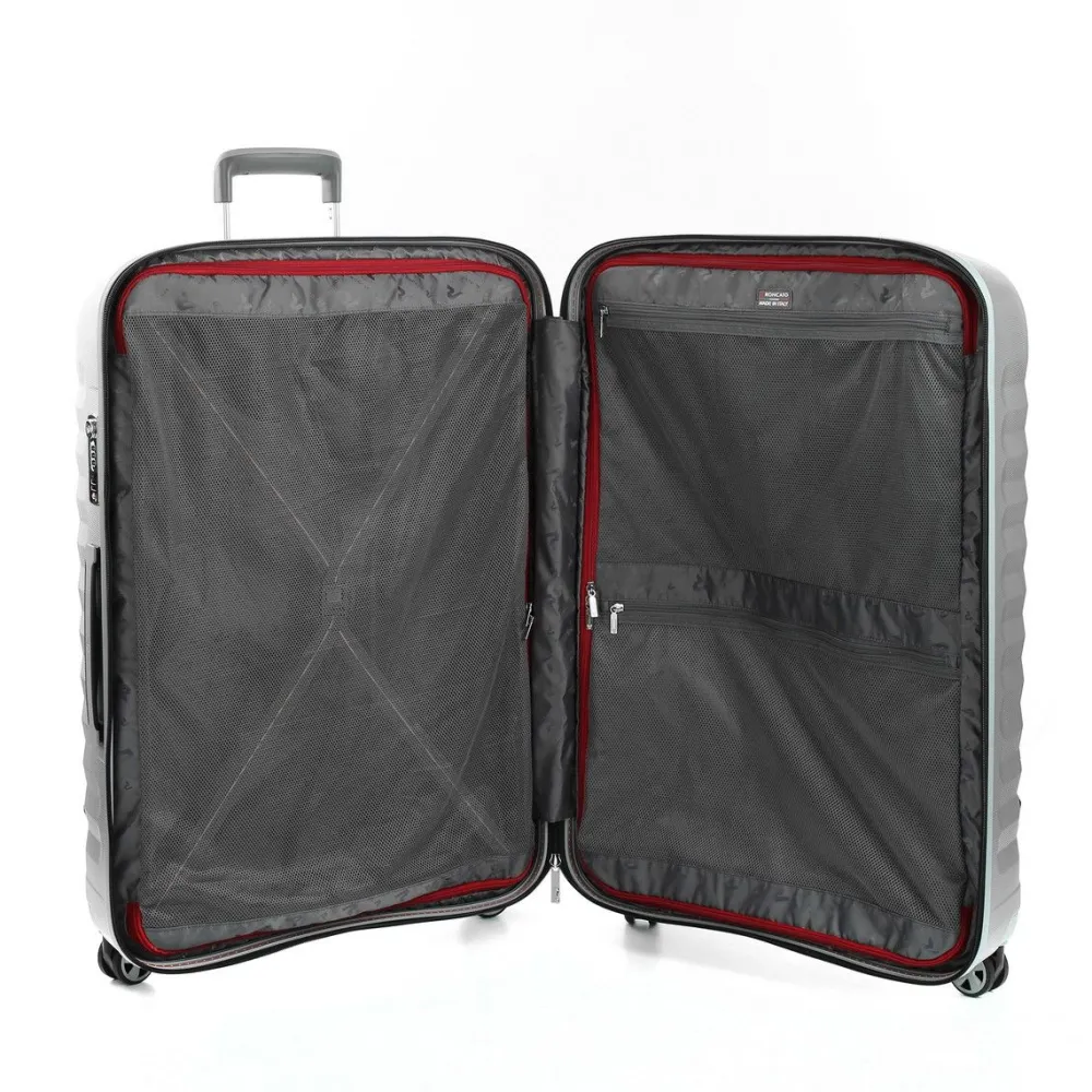 Trolley Roncato Uno ZSL Premium 2.0 grande 5467. Trolley realizzato in robusto policarbonato ultraleggero, 4 ruote doppie piroettanti per la massima manovrabilità , carrello di traino telescopico con push botton, chiusura a tripla combinazione con sistema TSA per gli Stati Uniti. Interno completamente foderato con divisorio, facile da rimuovere per la pulizia. Made in Italy – Garanzia 10 anni.