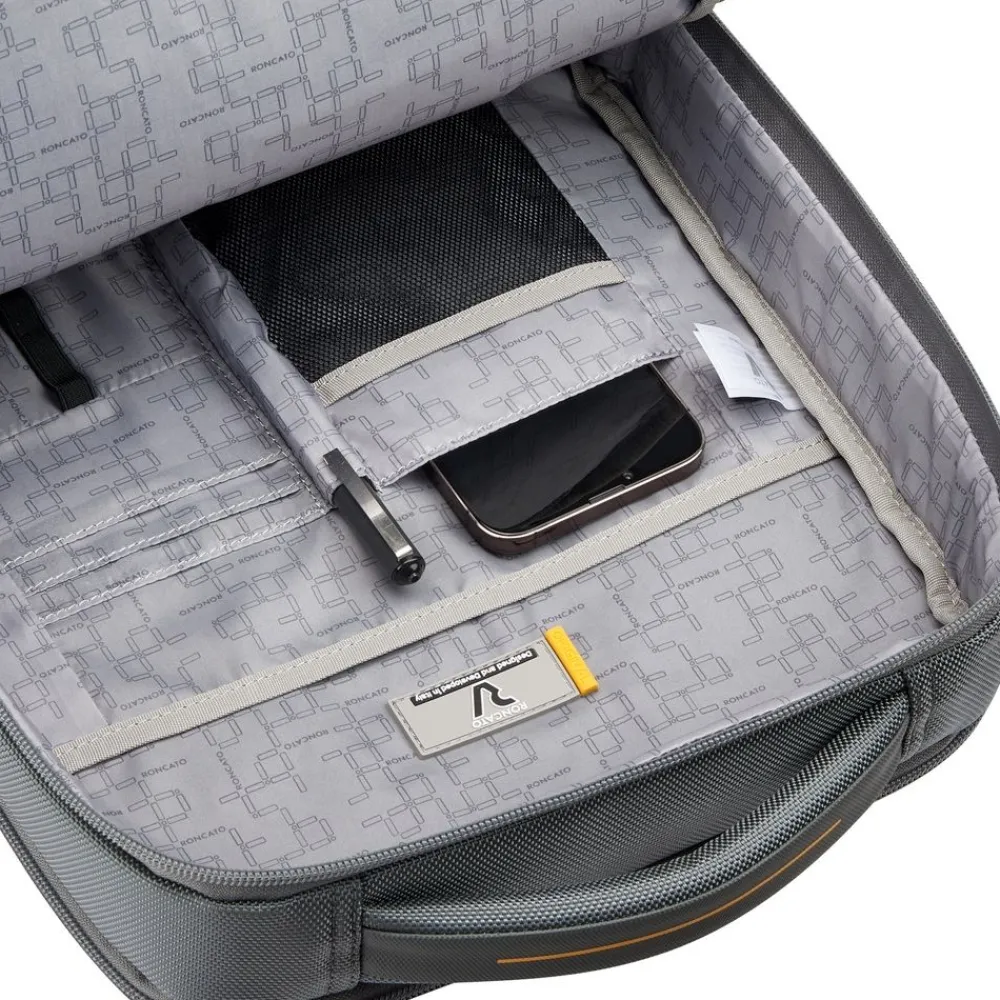 Zaino lavoro 14″ Roncato Trial 2246. Realizzato in robusto nylon e poliestere, spallacci e schienale gommati e traspiranti. Due tasche principali con vano porta pc 14″ e tablet, tasca frontale. Passante asta trolley posteriore. Maniglia superiore. Garanzia 3 anni.