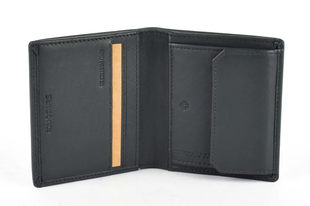 Portafoglio uomo piccolo Samsonite Attack 2 SLG 124. Realizzato in vera pelle di alta qualità , con vano portadocumenti, vano portabanconote, tasca portamonete chiusa da bottone. Protezione RFID. Logo Samsonite frontale.