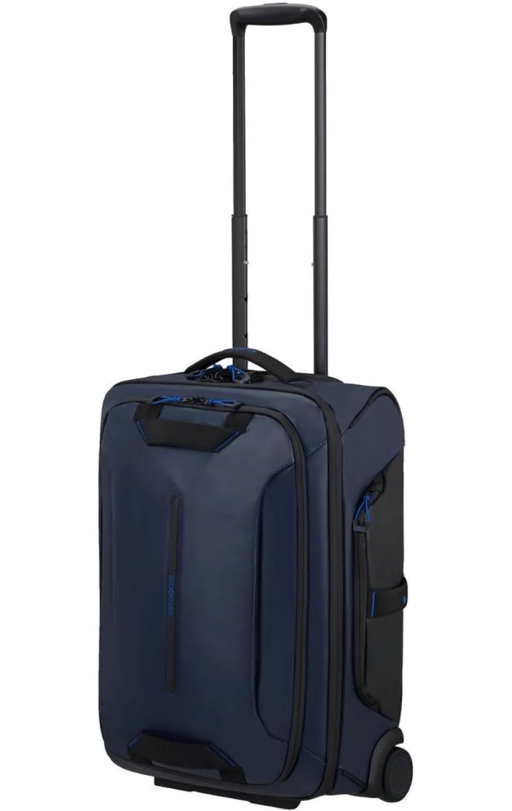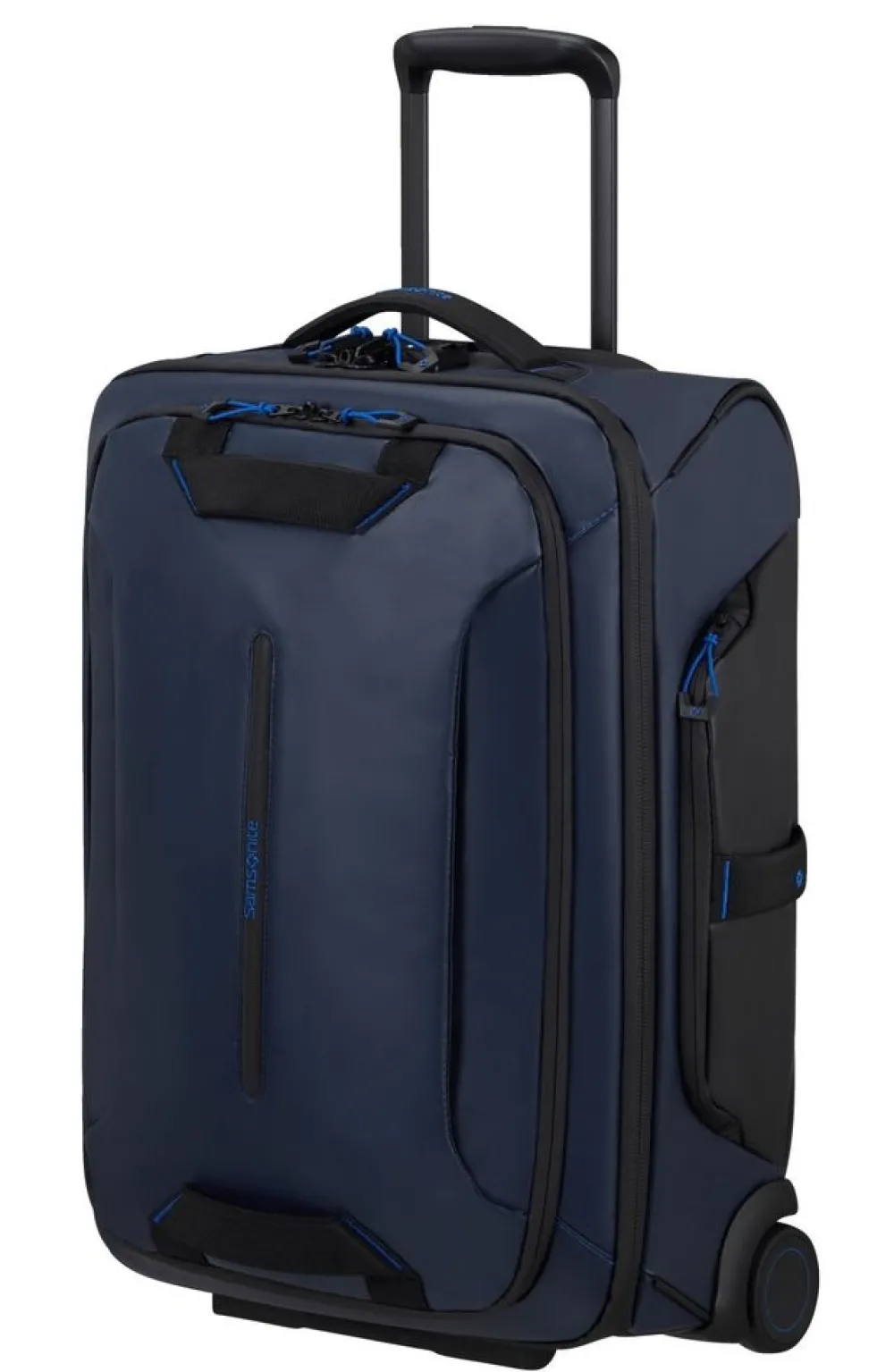 Trolley cabina Samsonite Ecodiver. Trolley cabina realizzato in robusto materiale gommato, 100% riciclato PET e resistente all’acqua. Due grandi e silenziose ruote integrate, sistema di sicurezza a tripla combinazione e TSA per gli Stati Uniti. Carrello di traino bitubo regolabile in altezza con push botton, maniglie di servizio superiore, laterale e frontali. Interno con nastri per bloccare l’abbigliamento e tasca per piccoli oggetti. Porta indirizzo integrato. Garanzia 5 anni.