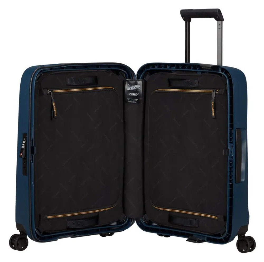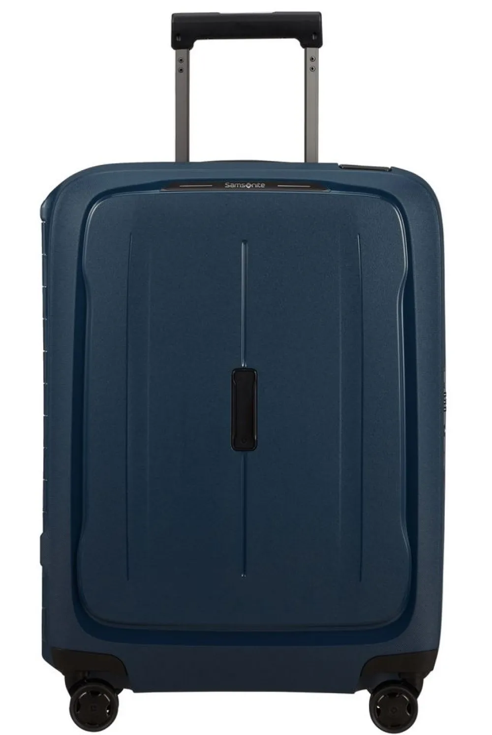 Trolley cabina Samsonite Essens. Trolley cabina realizzato in robusto polipropilene riciclato, quattro grandi e silenziose ruote piroettanti, robusti ganci di chiusura con sistema di sicurezza a tripla combinazione e TSA per gli Stati Uniti, ganci laterali con blocco. Carrello di traino regolabile in altezza con push botton, maniglia di servizio laterale. Interno completamente foderato, con fodere estrabili e trasportabili con pratiche maniglie. Logo frontale personalizzabile (forniti con il bagaglio 4 diversi loghi adesivi). Garanzia 5 anni.