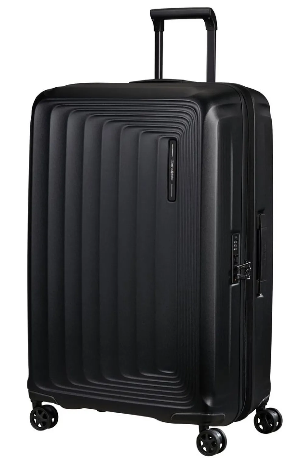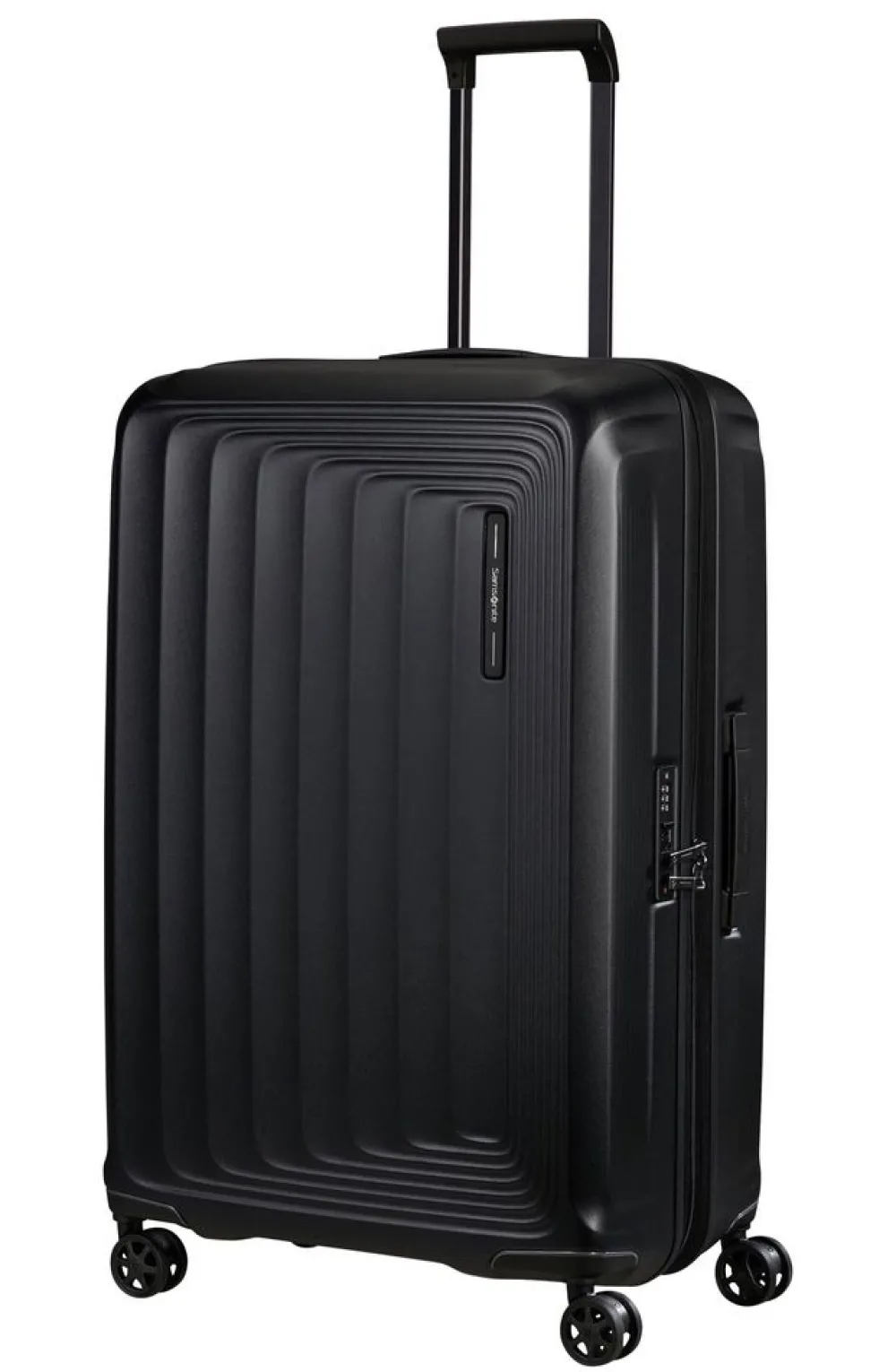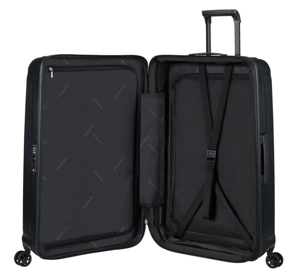 Trolley grande 75cm Samsonite Nuon. Trolley realizzato in robusto policarbonato, 4 ruote piroettanti gemellari per la massima manovrabilità . Carrello di traino telescopico con push botton, chiusura a tripla combinazione con sistema TSA per gli Stati Uniti. Interno foderato con divisorio e nastri per bloccare l’abbigliamento. Zip di espansione. Garanzia 5 anni.