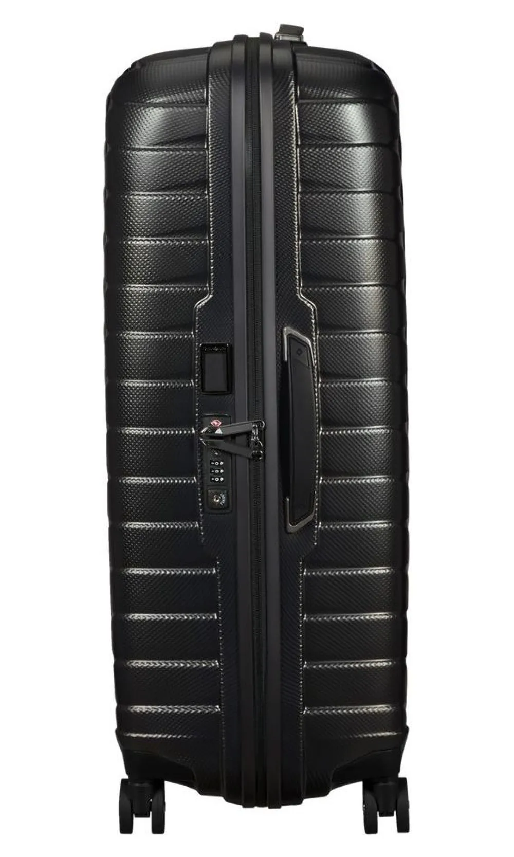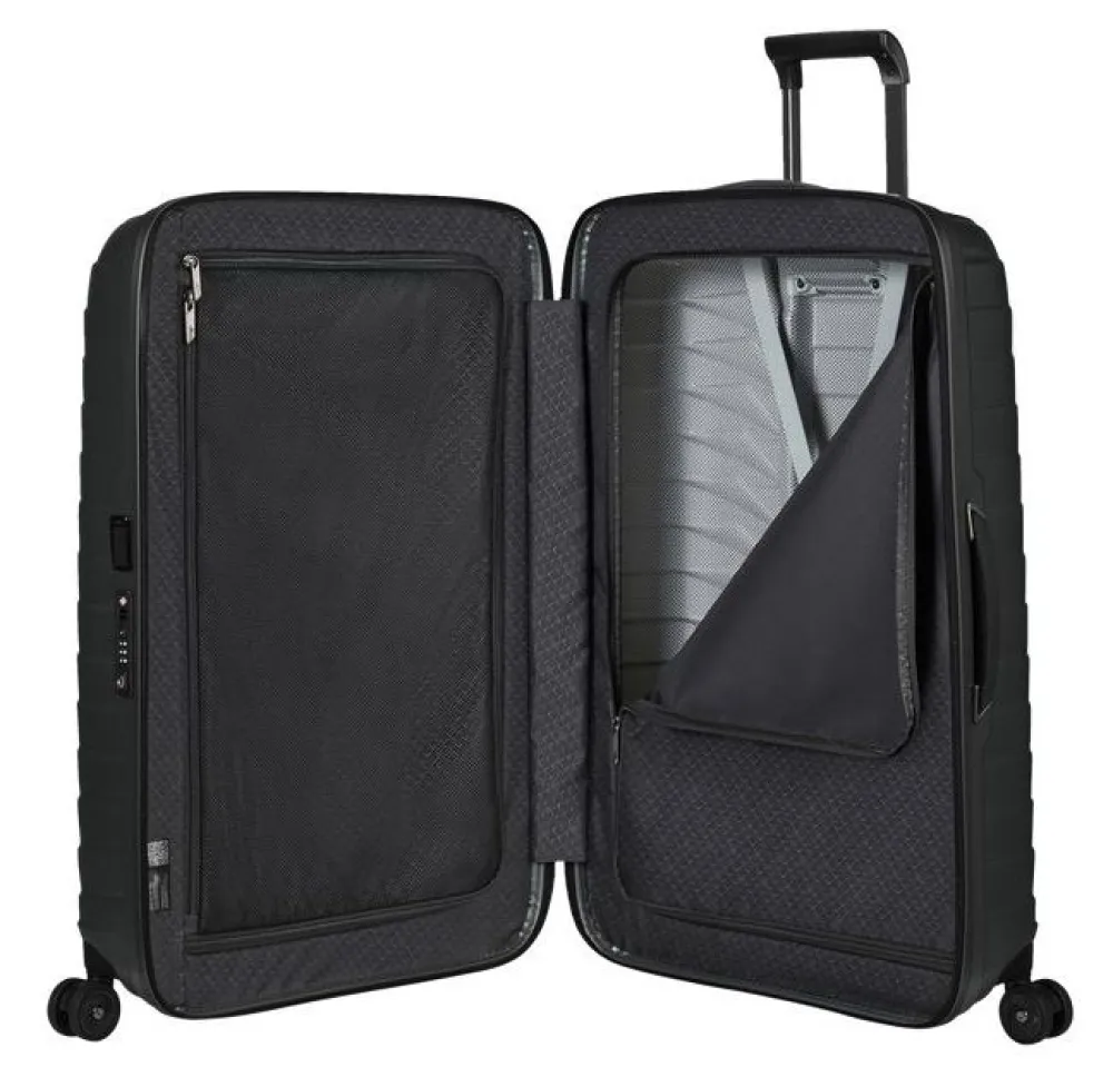 Trolley grande 75cm Samsonite Proxis. Trolley realizzato in robusto Roxkinâ„¢, 4 ruote piroettanti gemellari per la massima manovrabilità . Carrello di traino telescopico bitubo con push botton, chiusura a tripla combinazione con sistema TSA per gli Stati Uniti. Interno foderato con divisorio e nastri per bloccare l’abbigliamento. Tag ID integrato e retrattile. Garanzia 10 anni.