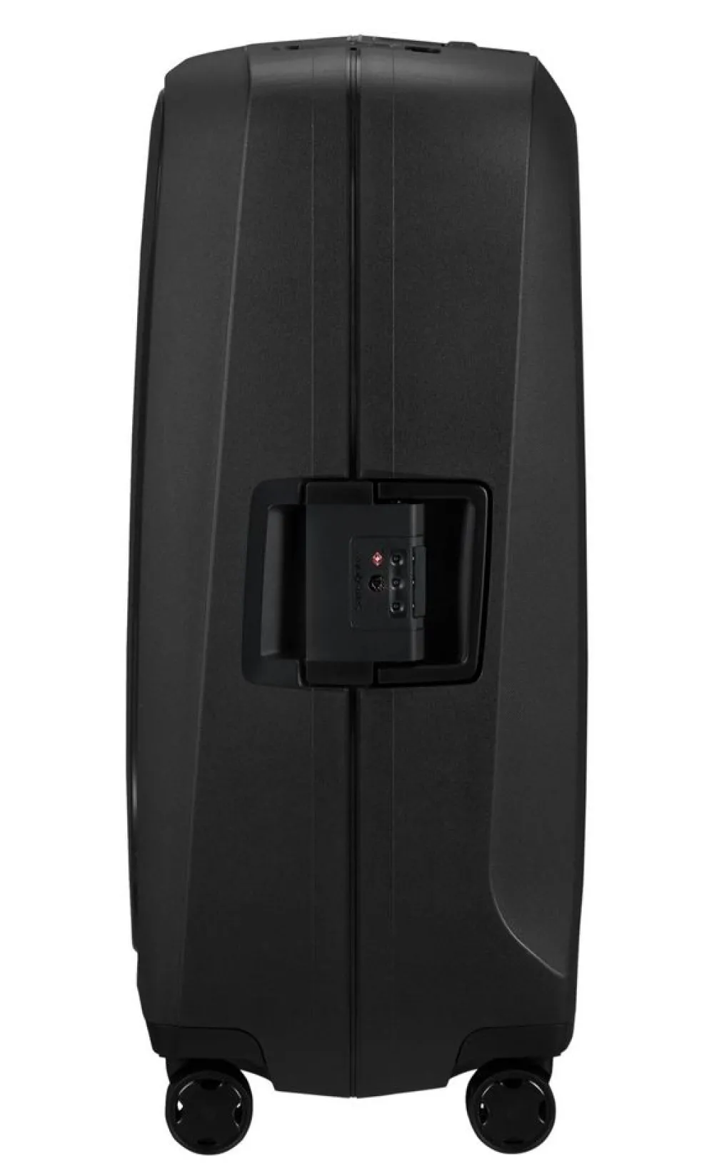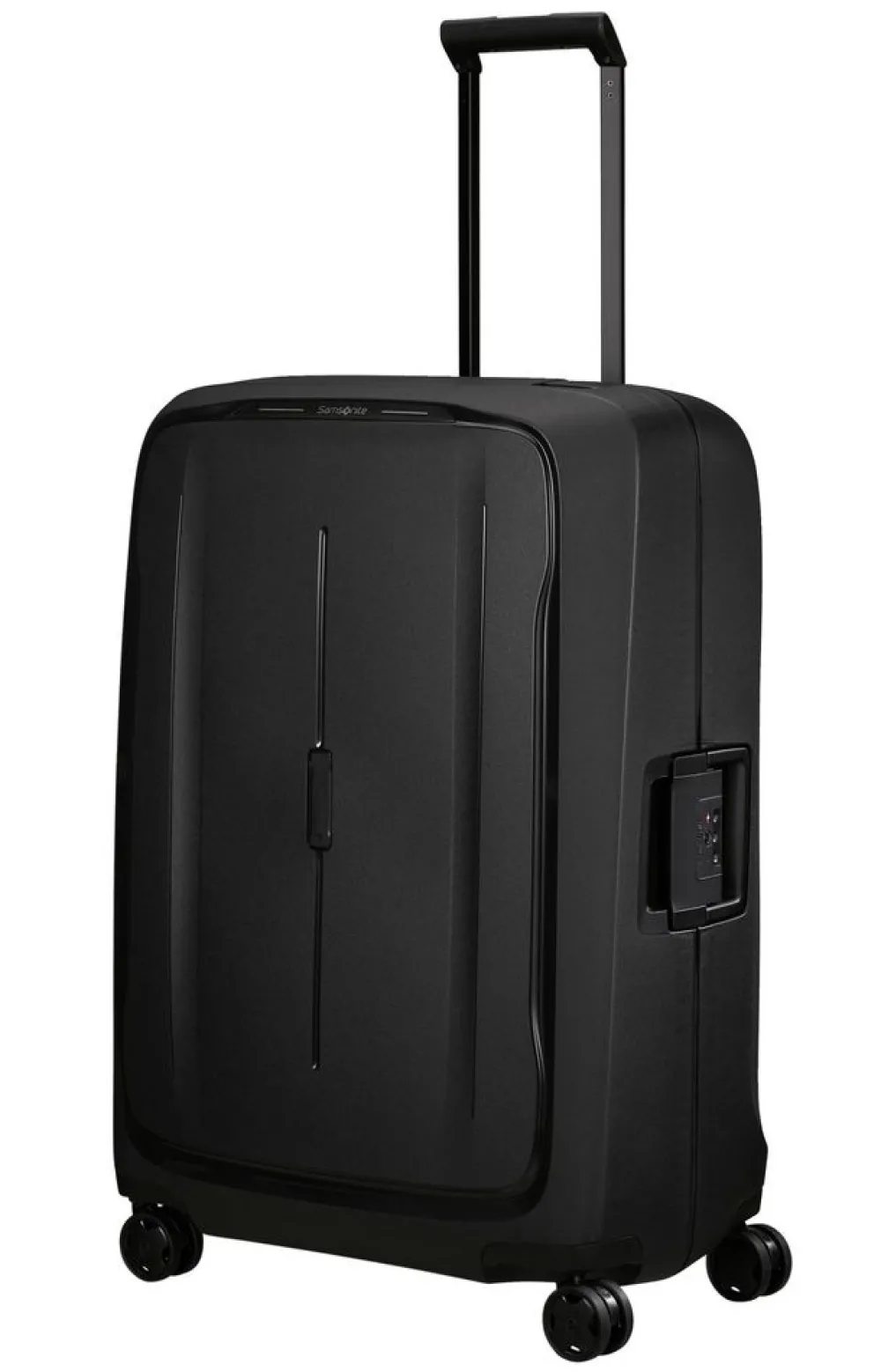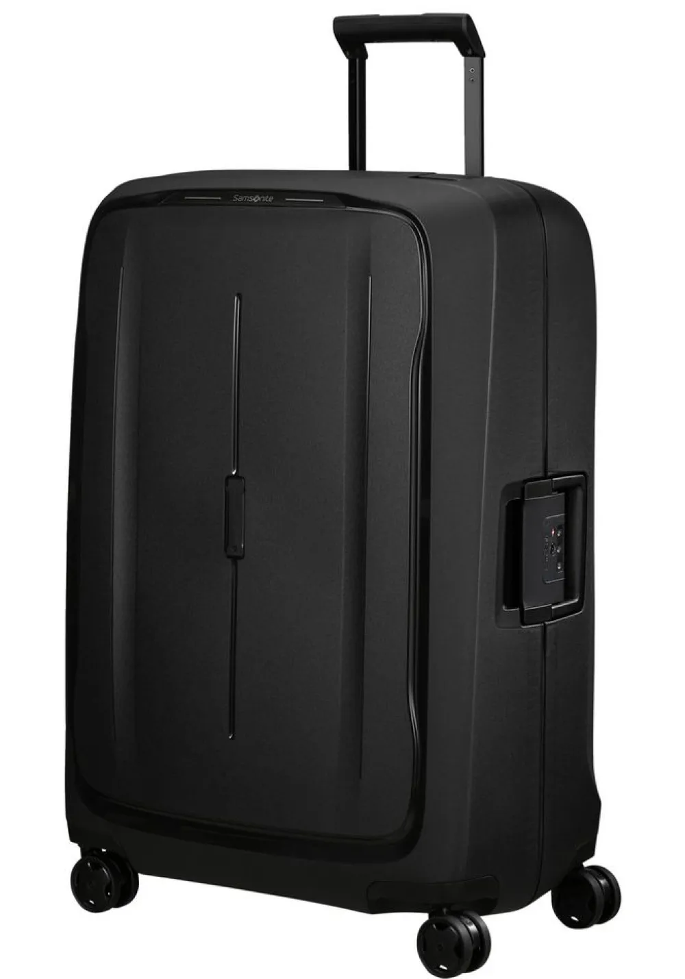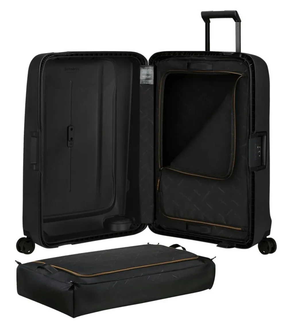 Trolley grande Samsonite Essens. Trolley realizzato in robusto polipropilene riciclato, quattro grandi e silenziose ruote piroettanti, robusti ganci di chiusura con sistema di sicurezza a tripla combinazione e TSA per gli Stati Uniti. Carrello di traino regolabile in altezza con push botton, maniglia di servizio laterale. Interno foderato, con fodere estraibili e trasportabili con due pratiche maniglie. Logo frontale personalizzato (vengono forniti quattro diversi loghi adesivi, per rendere il bagaglio subito riconoscibile). Garanzia 5 anni.