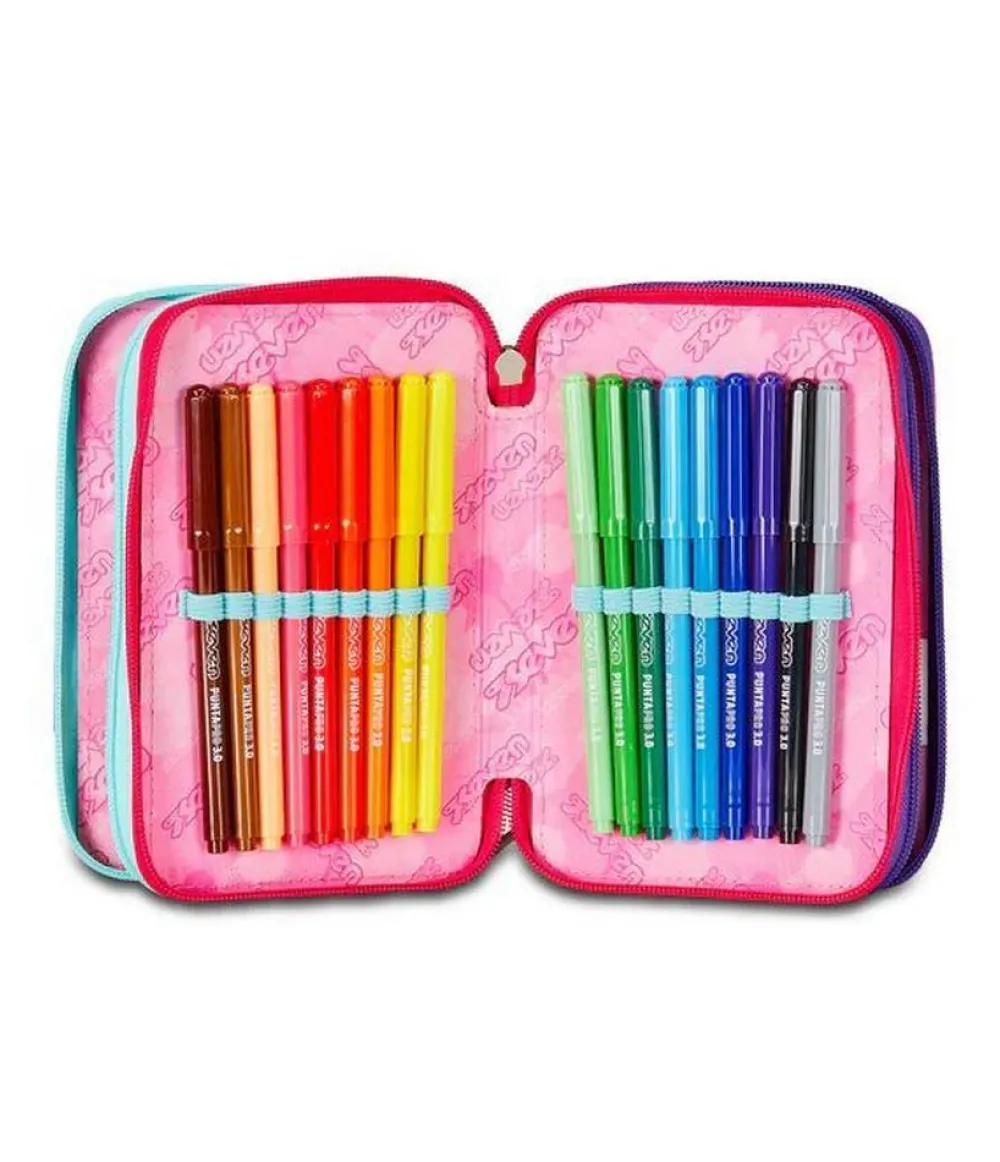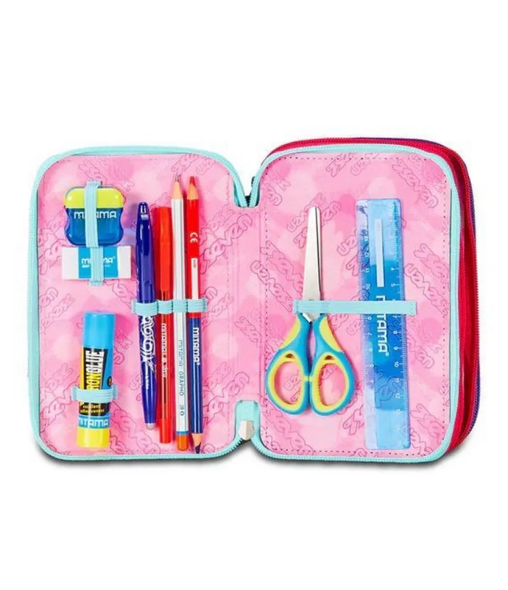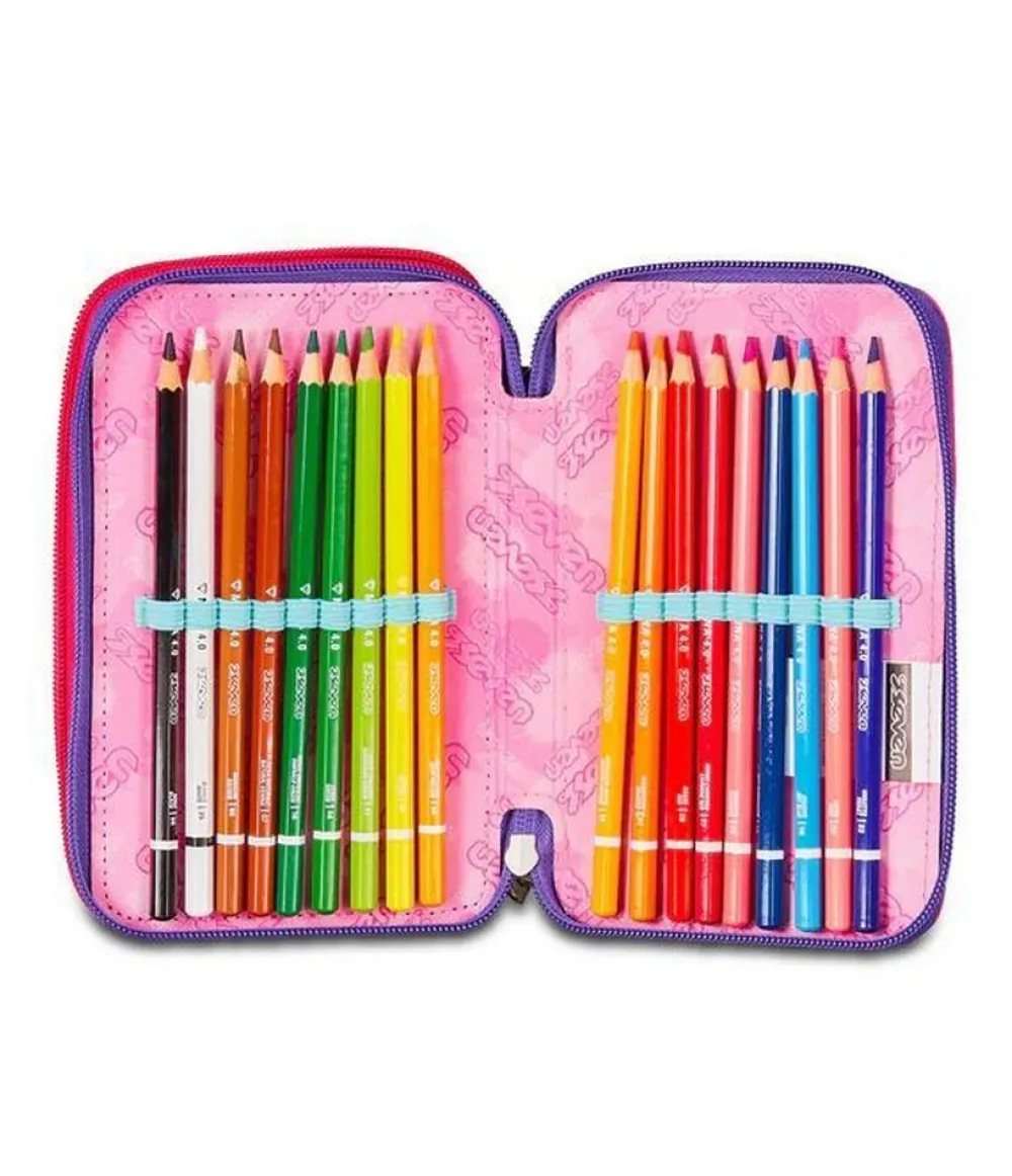 Astuccio per la scuola 3 zip SJ. Realizzato in robusto poliestere, con tre tasche principali chiuse da zip, complete di tutto l’occorrente per la scuola!