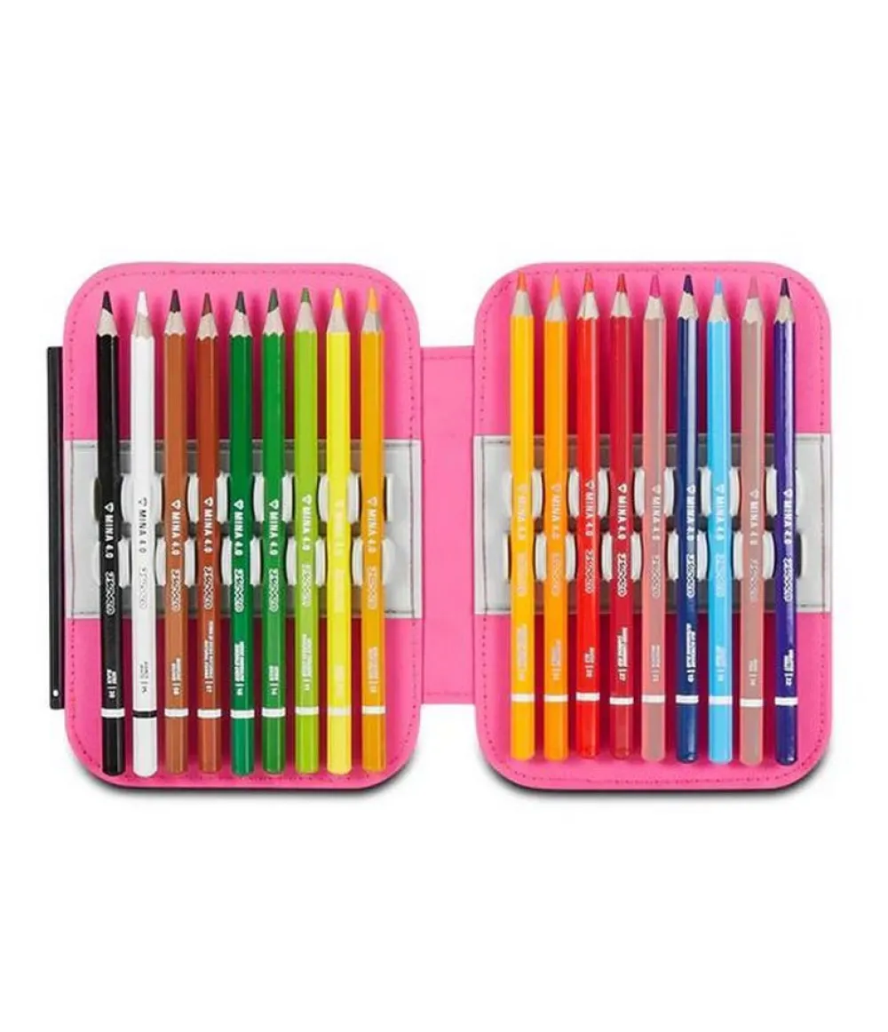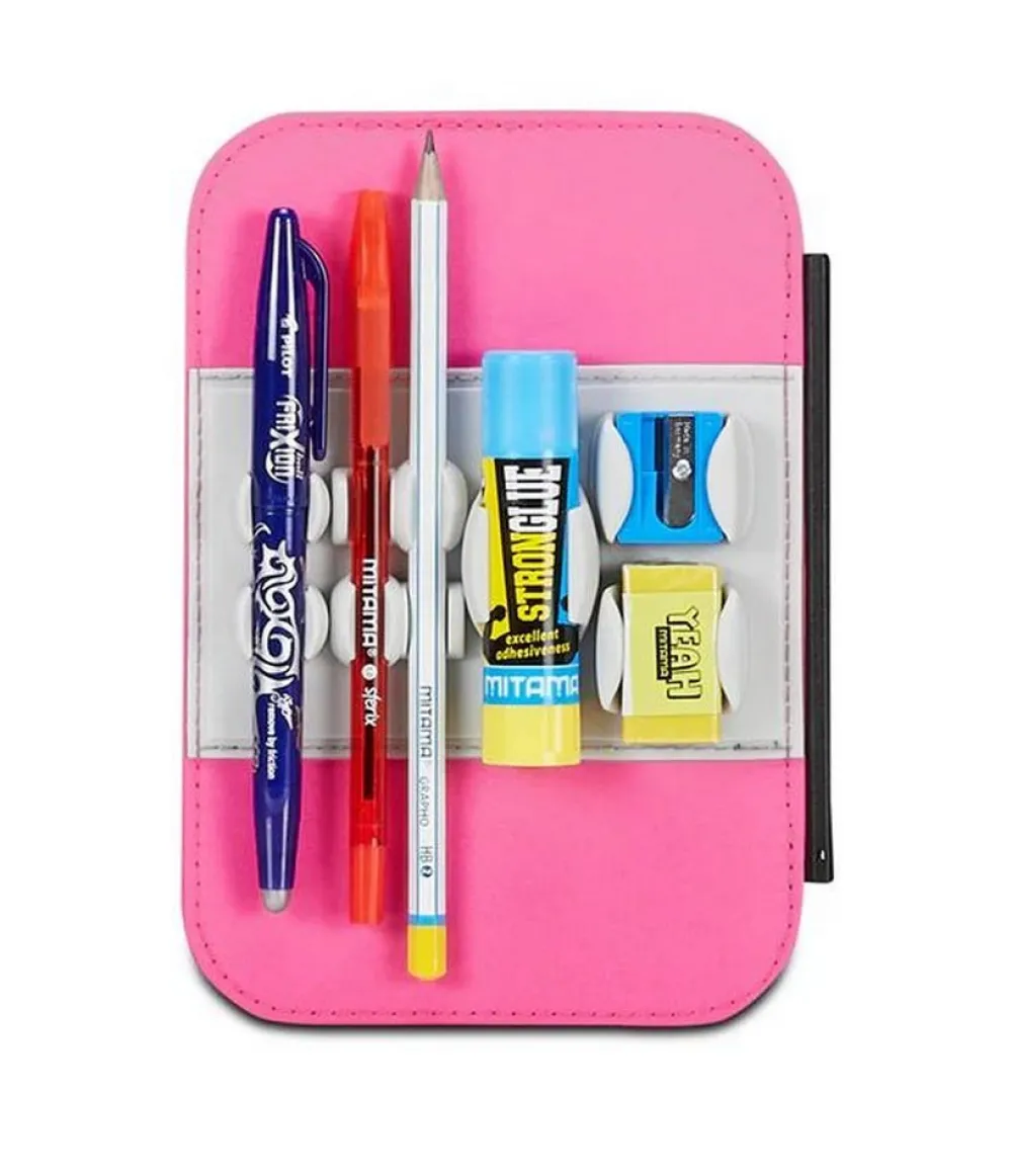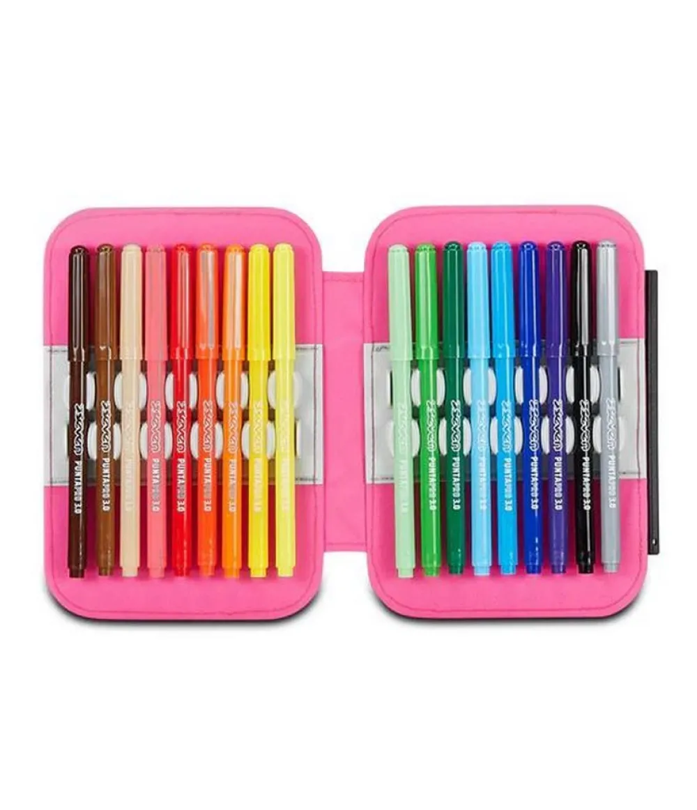 Contenuto (44 pezzi):Â 18 Pastelli a colori, 18 Pennarelli, 1 Penna cancellabile blu, 1 Penna a sfera rossa, 1 Matita HB, 1 Gomma, 1 Temperino barilotto a 2 fori, 1 Colla stick, 1 Righello, 1 Paio di Forbici in metallo