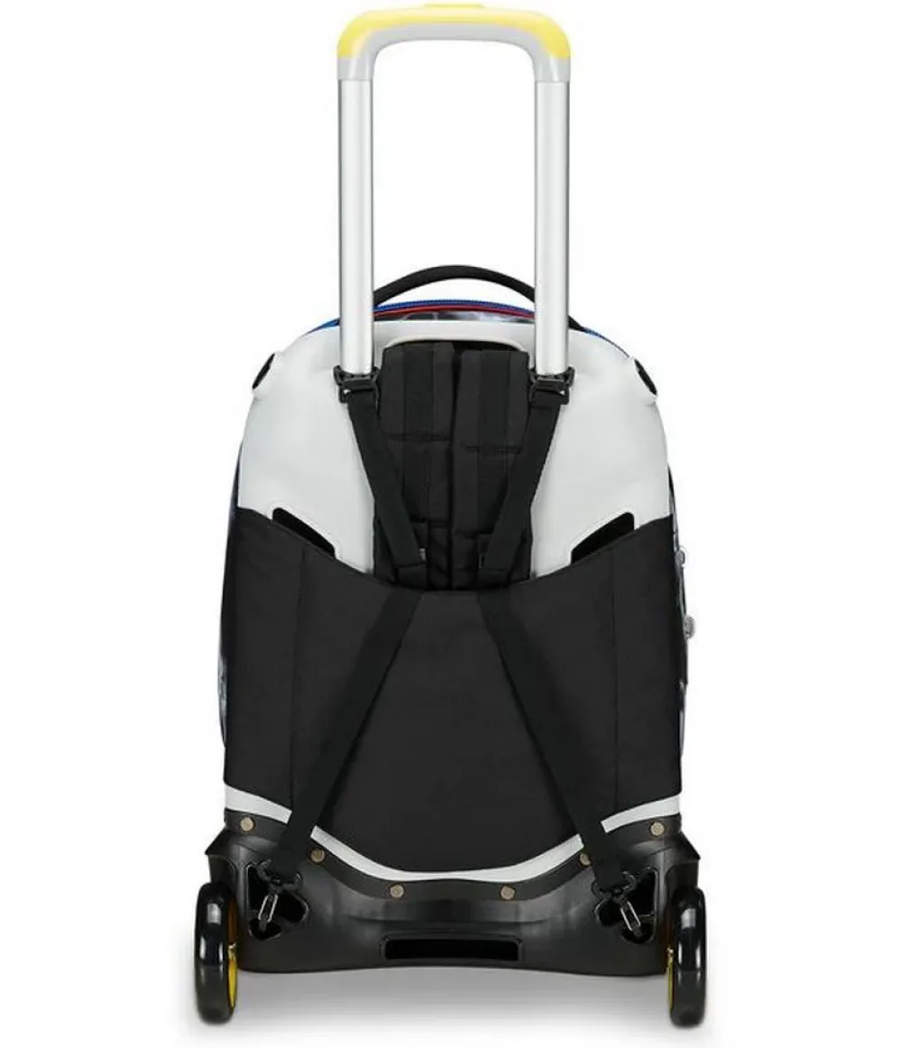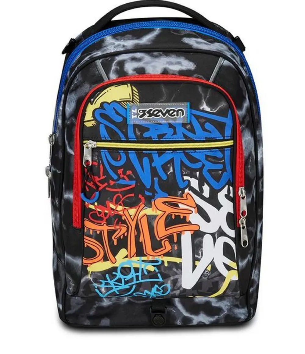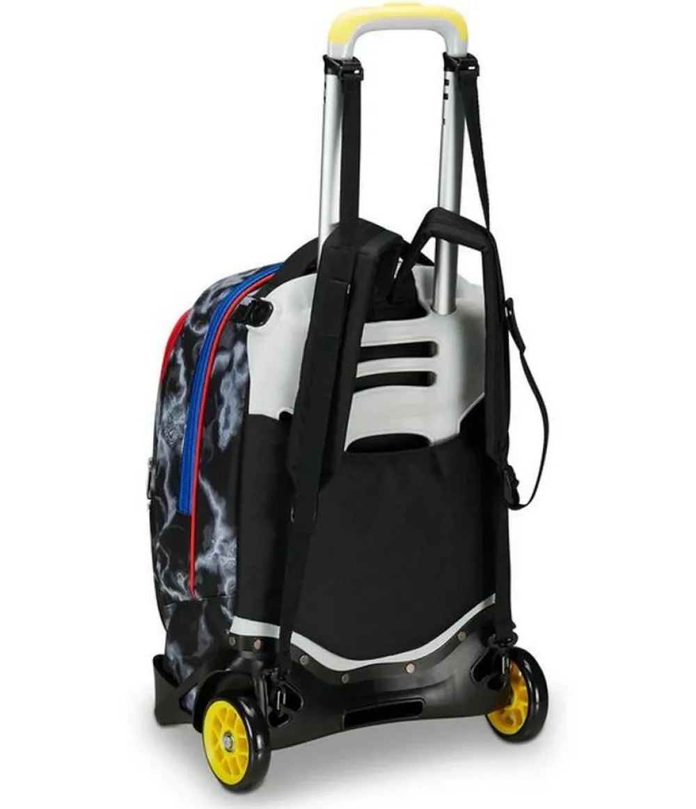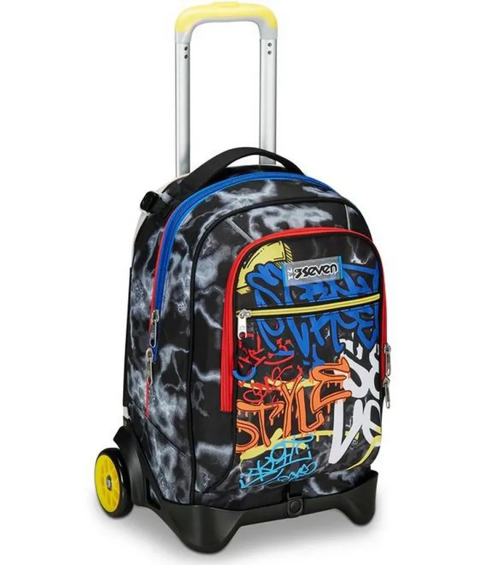 Trolley scuola Seven Jack 2 ruote. Zaino realizzato in robusto poliestere, schienale imbottito e rivestito in tessuto, spallacci imbottiti e traspiranti. Lo zaino Jack di Seven può essere comodamente sganciato dal carrello di traino in poche semplici mosse, per la pulizia o per la portabilità a zaino. Il carrello di traino è rinforzato con push botton, il fondo rigido e le grandi ruote gommate e silenziose da 10 cm garantiscono un trasporto semplice in ogni condizione. Ampia tasca principale e tasca frontale chiuse da zip. Il Crossover System consente di trascinare il trolley senza sporcare gli spallacci: quando solleverai la barra telescopica di traino gli spallacci si alzeranno in maniera automatica!