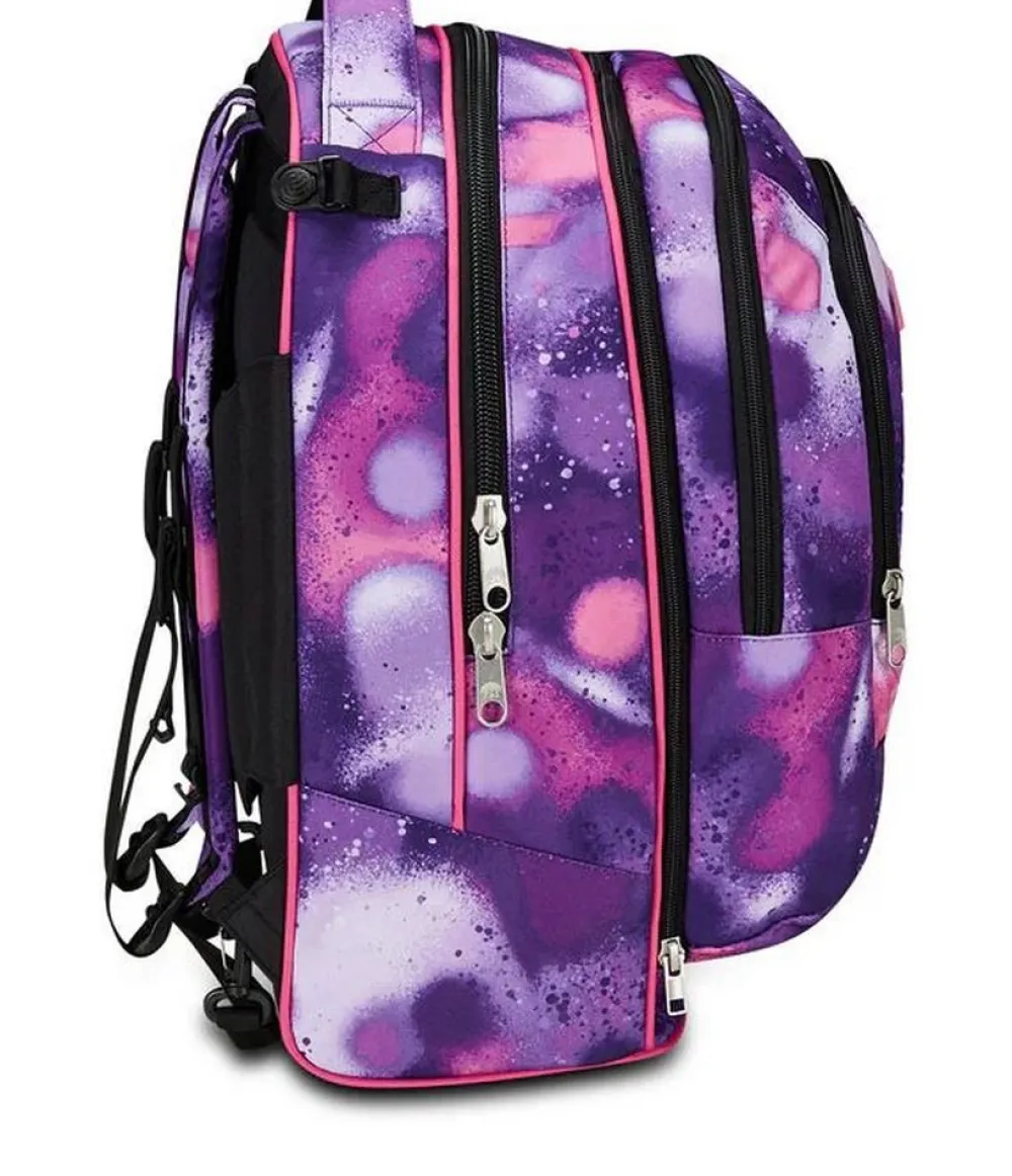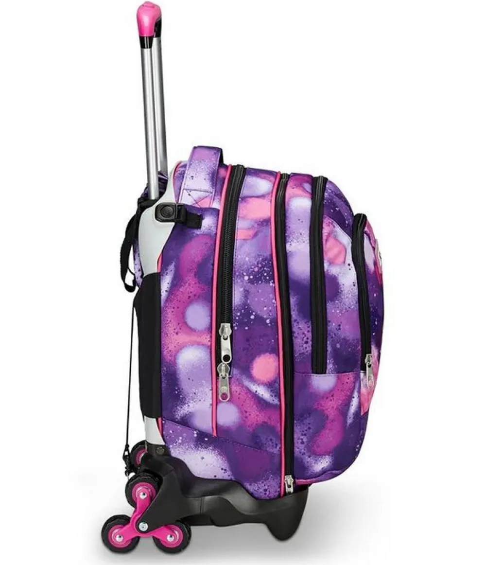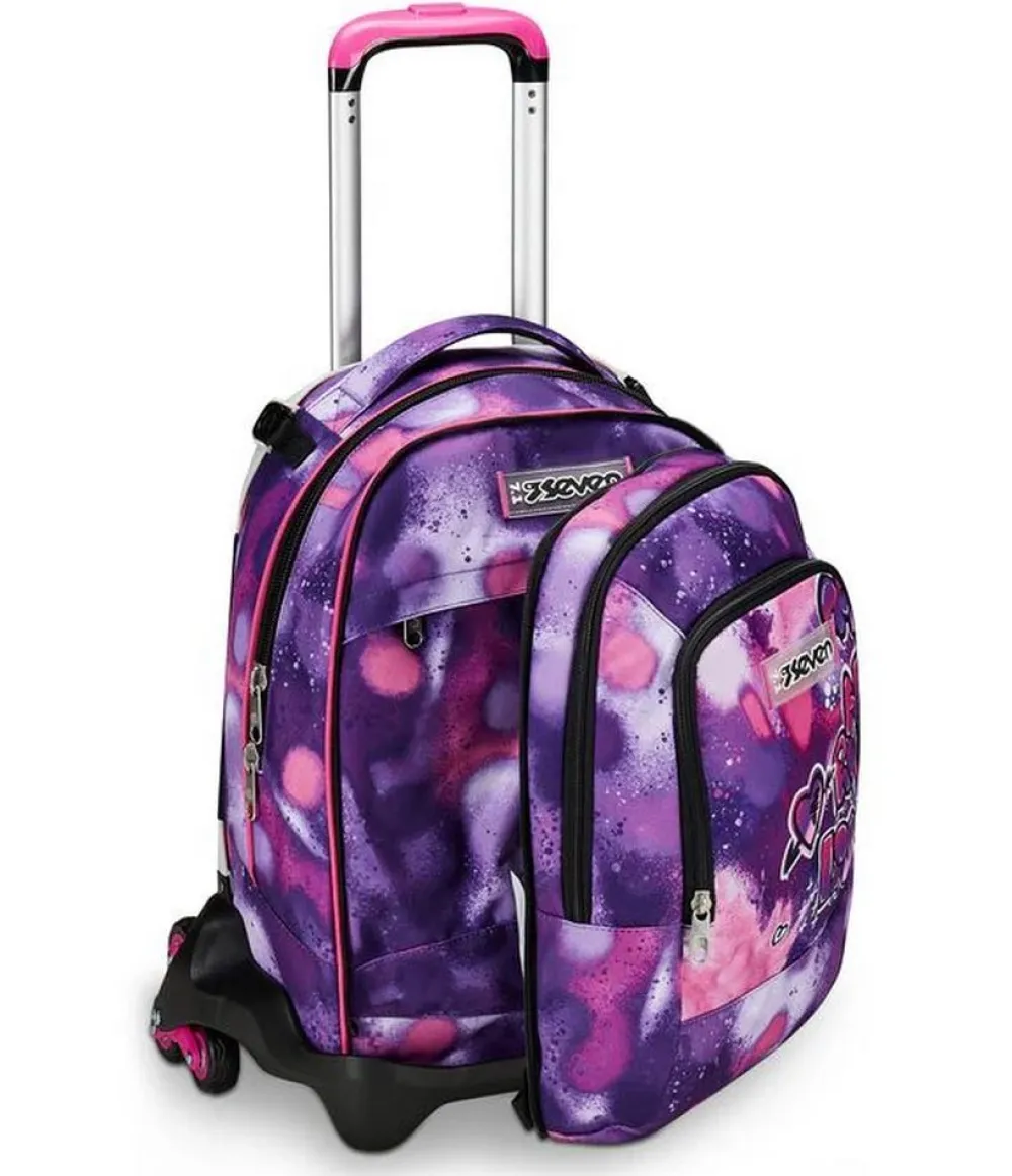 Trolley scuola Seven Jack 3 ruote Detach . Zaino realizzato in robusto poliestere, schienale imbottito e rivestito in tessuto, spallacci imbottiti e traspiranti. Lo zaino Jack di Seven può essere comodamente sganciato dal carrello di traino in poche semplici mosse, per la pulizia o per la portabilità a zaino. Il carrello di traino è rinforzato con push botton, il fondo rigido. Ampia tasca principale e tasca frontale chiuse da zip. Il Crossover System consente di trascinare il trolley senza sporcare gli spallacci: quando solleverai la barra telescopica di traino gli spallacci si alzeranno in maniera automatica! L’innovativo sistema a 3 ruote consente di superare anche i gradini, senza sollevare lo zaino!