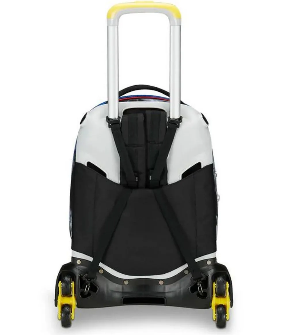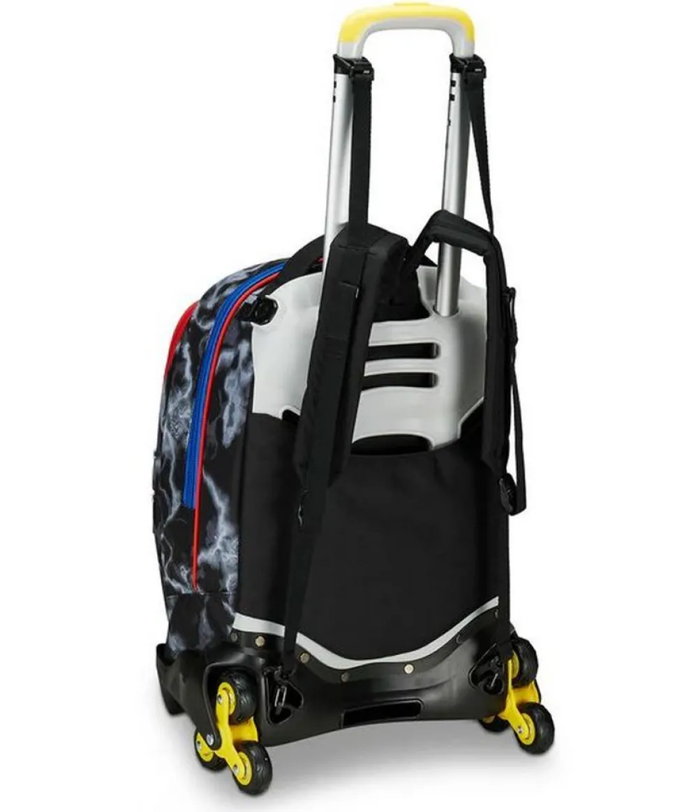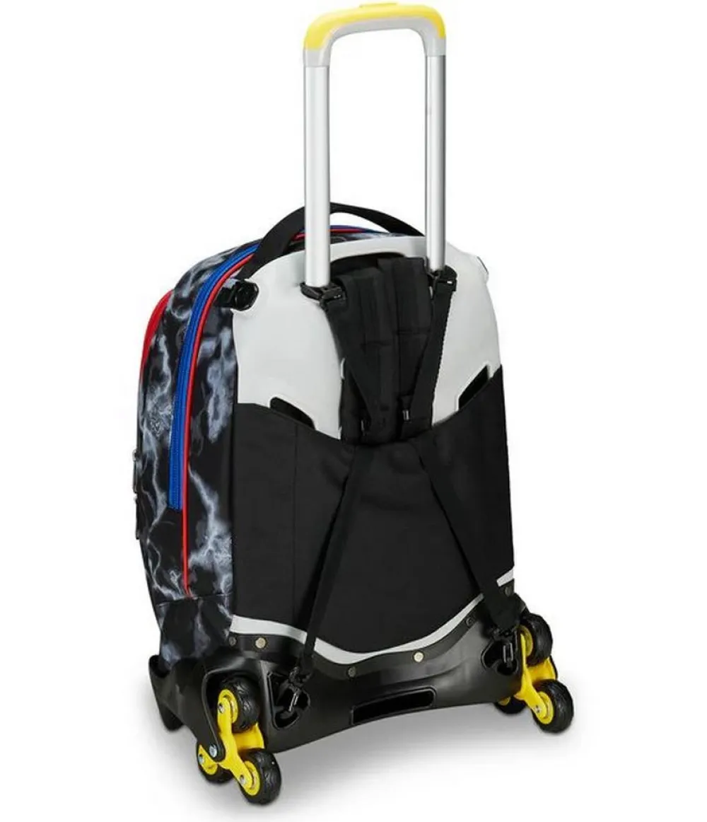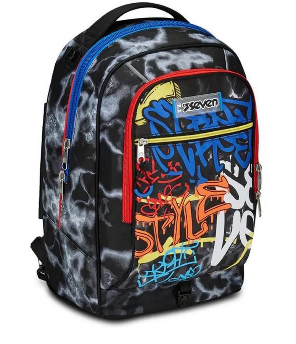 Trolley scuola Seven Jack 3 ruote. Zaino realizzato in robusto poliestere, schienale imbottito e rivestito in tessuto, spallacci imbottiti e traspiranti. Lo zaino Jack di Seven può essere comodamente sganciato dal carrello di traino in poche semplici mosse, per la pulizia o per la portabilità a zaino. Il carrello di traino è rinforzato con push botton, il fondo rigido. Ampia tasca principale e tasca frontale chiuse da zip. Il Crossover System consente di trascinare il trolley senza sporcare gli spallacci: quando solleverai la barra telescopica di traino gli spallacci si alzeranno in maniera automatica! L’innovativo sistema a 3 ruote consente di superare anche i gradini, senza sollevare lo zaino!