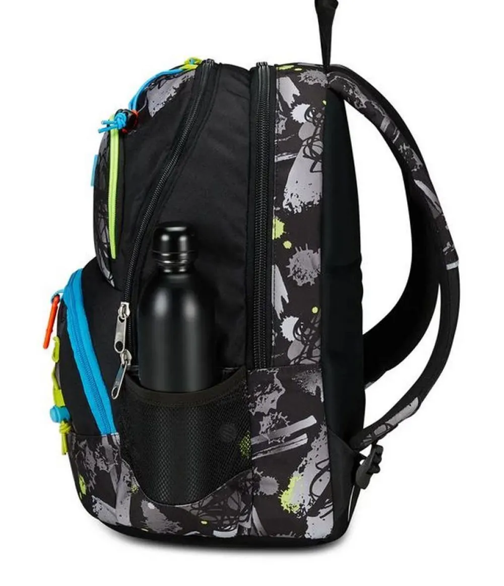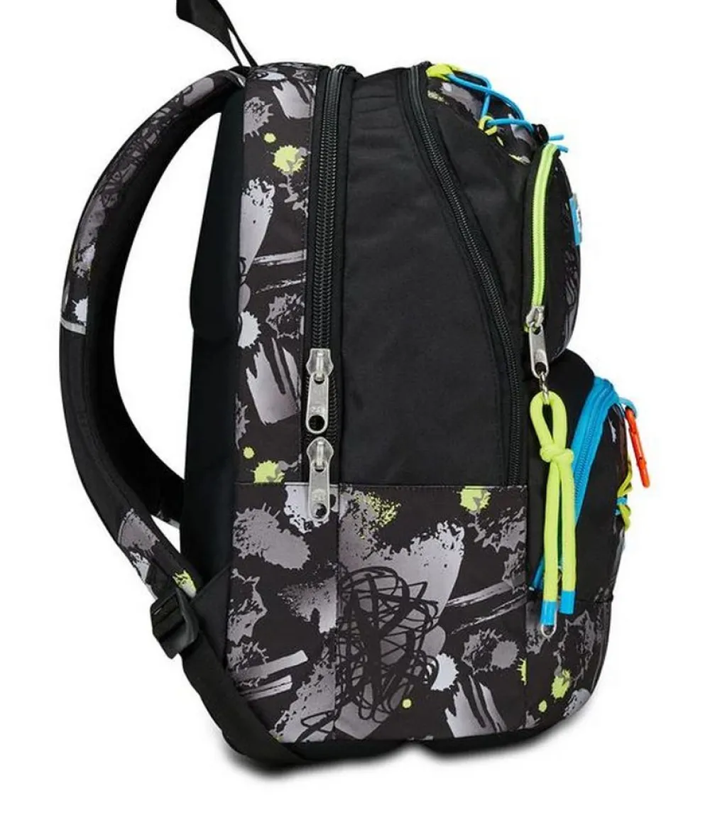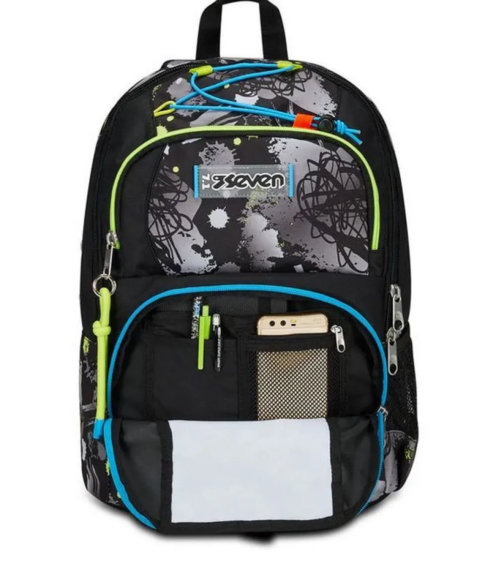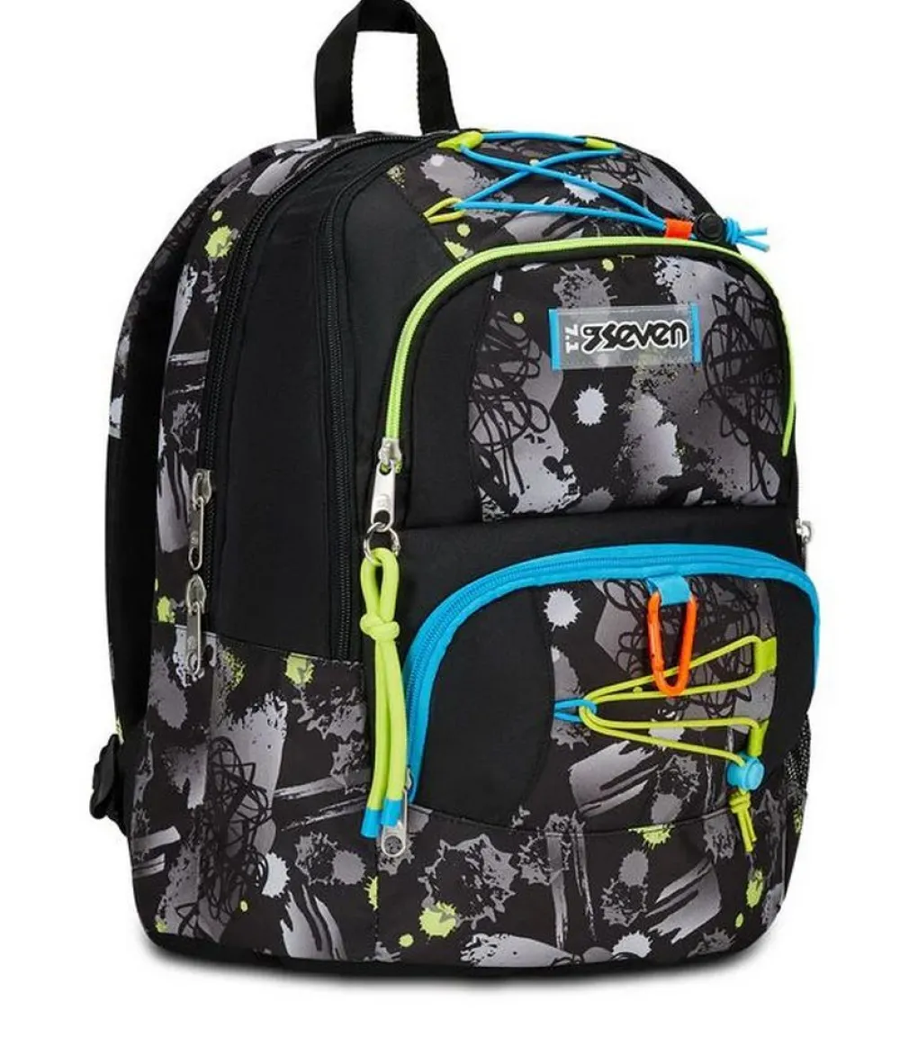 Zaino scuola Seven Advanced. Zaino realizzato in robusto poliestere, schienale in preformato e fondo integrato. Spallacci imbottiti e traspiranti, maniglia di servizio superiore. Tasca interna porta tablet/pc e tasca frontale organizzata per smartphone e piccoli oggetti. Tasche laterali chiuse da zip. Garanzia 4 anni.