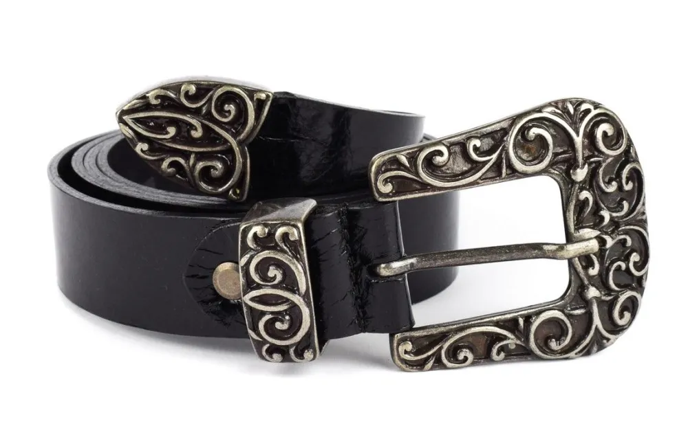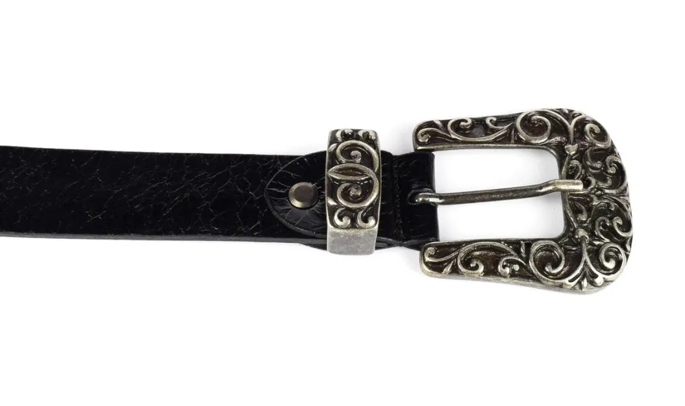 Fibbia metallica con lavorazione. Passante e puntale metallico.